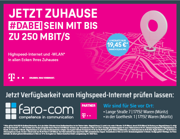 Derzeit gibt es seinen Angaben zufolge viele Nachfragen in Sachen 5G, das mit den entsprechenden Geräten auch in der Müritz-Region schon verfügbar ist und teilweise Empfangslücken gerade in kleineren Orten schließt. In den bestehenden Telekom-Verträgen ist 5G übrigens schon enthalten. Alle wichtigen Infos dazu gib es in den faro-Filialen.
