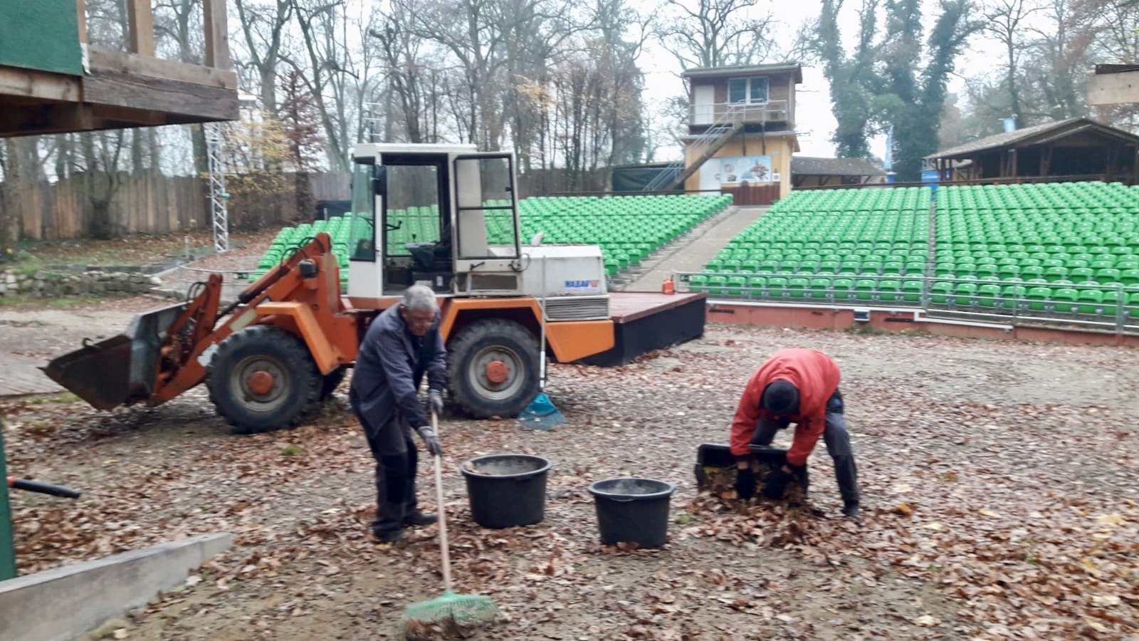 Foto unten: Auf der Freilichtbühne wird schon kräftig aufgeräumt.