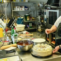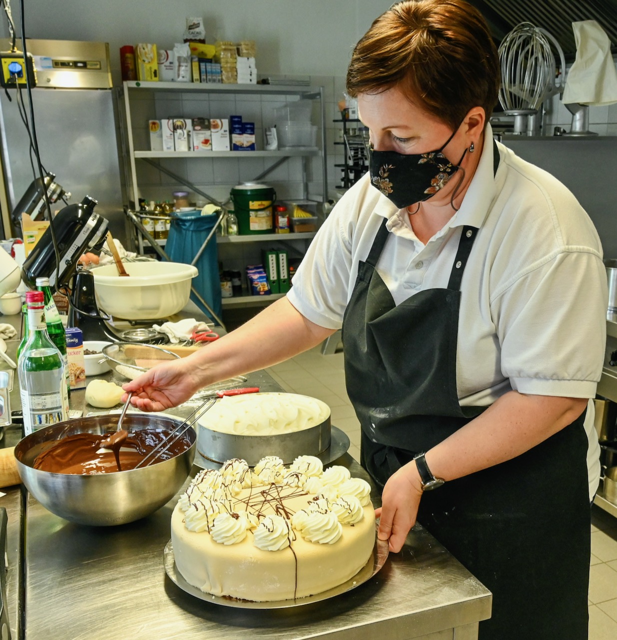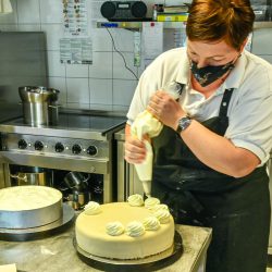 „Wir hatten jetzt eine Weile komplett zu, aber auch in dieser Zeit sind Nachfragen bei uns angekommen, so dass wir uns entschlossen haben, unsere Konditorei wieder zu öffnen und unsere Torten und Kuchen für den Außer-Haus-Verkauf anzubieten. In dieser Woche sind nur unsere beiden Konditorinnen am Werk, in der kommenden Woche dürfen dann auch unsere behinderten Mitarbeiter wieder mit machen“, berichtet Tobias Rödger als Chef des Hotels am Tiefwarensee.
