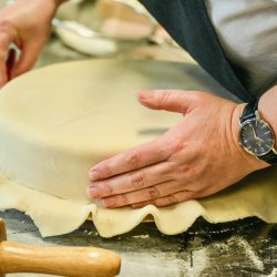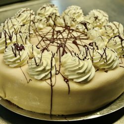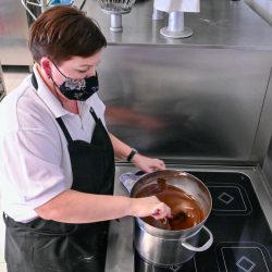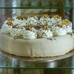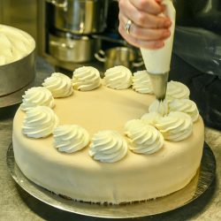 Und so sind die Konditorinnen Stefanie Garavito Vargas und Veronika Lehmann derzeit fleißig am Rühren, Sahne schlagen, Schokolade verfeinern sowie am Verzieren. Im Angebot sind unter anderem die beliebte Nuss-Marzipan-Torte, die Schwarzwälder-Kirsch-Torte, die Mandarinen-Schnitten, die Eierlikör-Torte und natürlich der absolute Renner – die Stachelbeer-Baiser-Torte. Die Kunden können direkt am Fenster der Konditorei auf dem Hof des Hotels kaufen, und zwar nicht nur ganze Torten, sondern auch einfach nur ein, zwei Stücken für den Nachmittags-Kaffee. Und sie können vorbestellen.