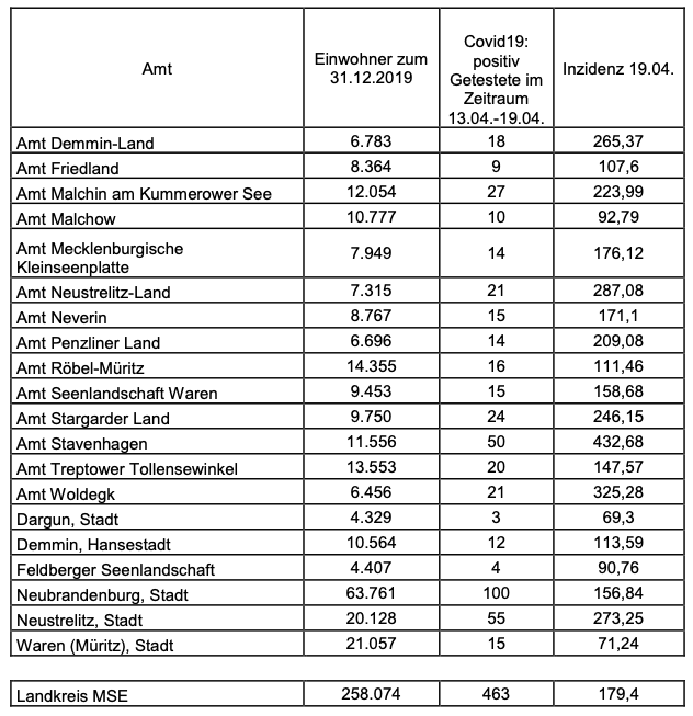 Heute hat der Landkreis Mecklenburgische Seenplatte wieder die Inzidenzzahlen für die einzelnen Städte und Ämter herausgegeben. Danach hat das Amt Stavenhagen mit 432,68 die höchste Inzidenz im Kreis. Das Amt Malchow meldet eine Inzidenz von 92,79, das Amt Penzliner Land von 209,08, das Amt Röbel-Müritz von 111,46, das Amt Seenlandschaft Waren von 158,68 und die Stadt Waren von 71,24.