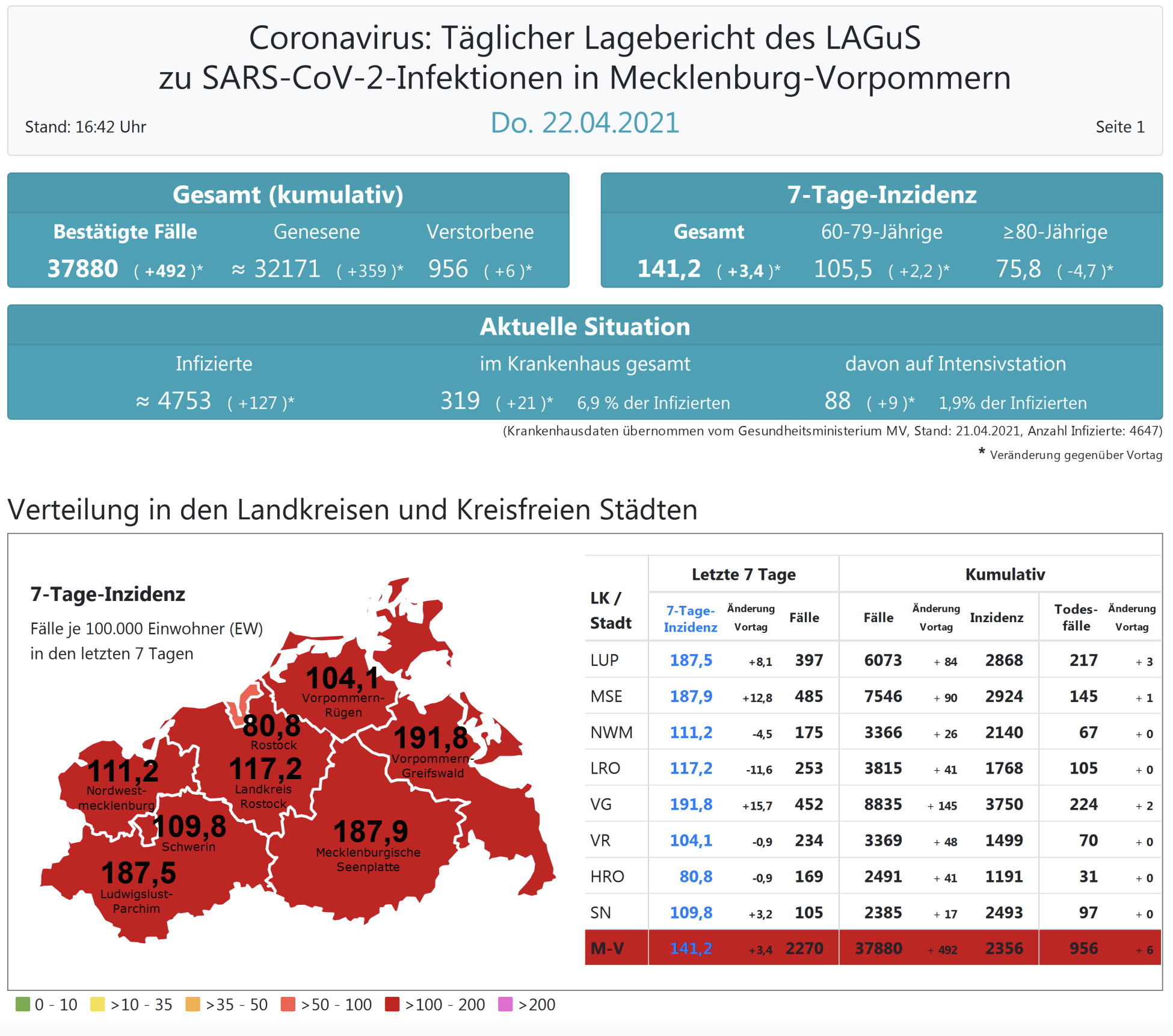 Der Inzidenzwert für ganz Mecklenburg-Vorpommern ist ebenfalls gestiegen und liegt heute bei 141,2 (gestern 138). Insgesamt meldet das Land Mecklenburg-Vorpommern heute 492 Neuinfektionen.