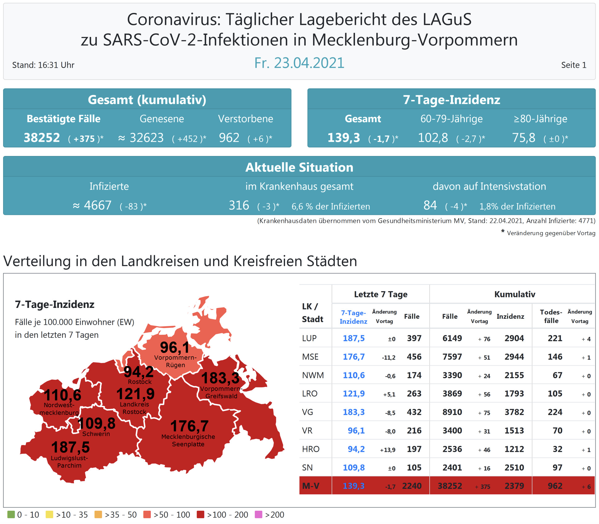 Der Inzidenzwert für ganz Mecklenburg-Vorpommern ist ebenfalls gesunken und liegt heute bei 139,3 (gestern 141,2). Insgesamt meldet das Land Mecklenburg-Vorpommern heute 375 Neuinfektionen.