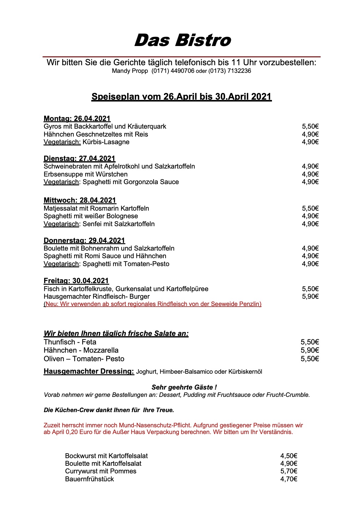 Die letzte Aprilwoche beginnt in „Das Bistro“ am Warener Amtsbrink mit Gyros und Backkartoffel, Hähnchen-Geschnetzeltes mit Reis sowie Kürbis-Lasagne.