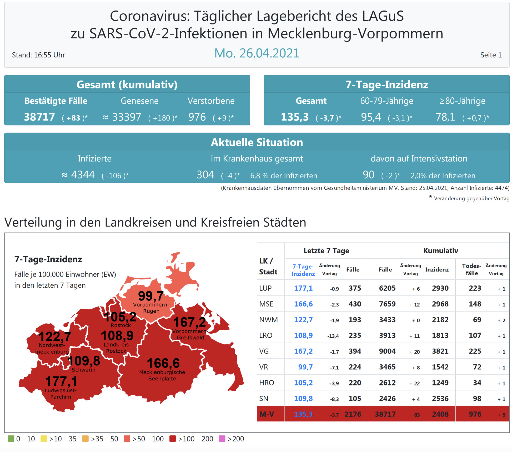 Der Inzidenzwert für ganz Mecklenburg-Vorpommern ist ebenfalls gesunken und liegt heute bei 135,3 (gestern 139,3). Insgesamt meldet das Land Mecklenburg-Vorpommern heute 83 Neuinfektionen.