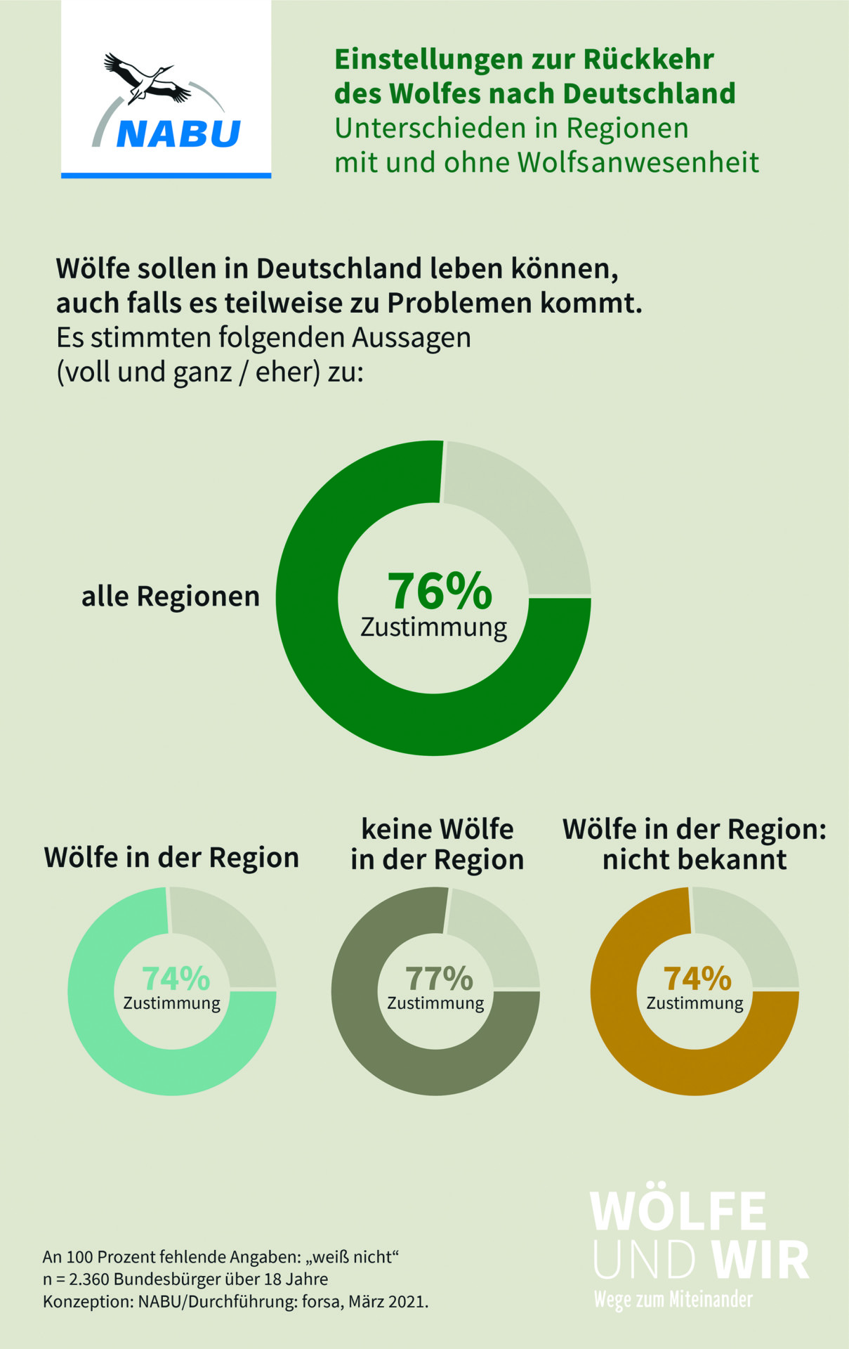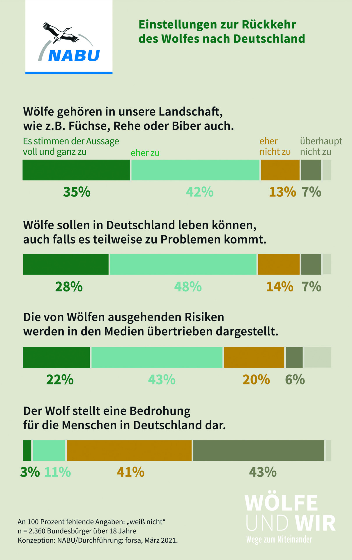 76 Prozent der Befragten gaben an, dass Wölfe selbst dann in Deutschland leben sollen, wenn es zu Problemen kommt. Der NABU wertet das als klares Votum für die grundsätzliche Daseinsberechtigung von Wölfen. 65 Prozent stimmen der Aussage zu, dass einzelne Wölfe, die Probleme verursachen, notfalls getötet werden müssen. Der NABU sieht darin eine Aufforderung an die Länder, ein effizientes Wolfsmanagement mit praktikablen Einzelfallentscheidungen auf die Beine zu stellen. In Bezug auf Nutztierrisse sind 38 Prozent der Befragten der Meinung, dass, wenn diese trotz Herdenschutz passieren, der verursachende Wolf kontrolliert getötet werden sollte. 49 Prozent lehnen diese Vorgehensweise ab.