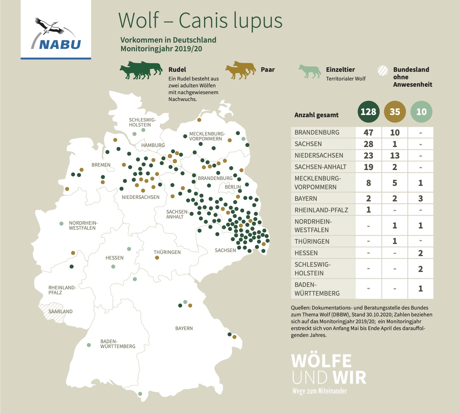 Die Menschen wurden zudem erstmals gefragt, ob es Wölfe in ihrer Region gibt. 28 Prozent der Befragten bejahten das. Bei 52 Prozent ist dies nicht der Fall, 20 Prozent konnten darüber keine Angaben machen. Die Umfrage zeigt, dass in Regionen mit Wölfen die Ablehnung der Tiere nur marginal höher ist als im Durchschnitt. Fast drei Viertel der Befragten begrüßen auch hier die Rückkehr von Wölfen, und meinen, dass sie wie andere Wildtiere in unsere Landschaft gehören (73 Prozent). Das ist auch bei Befragten der Fall, die im ländlichen Raum (Ortsgröße geringer als 20.000 Einwohner) leben. „Menschen in Wolfsgebieten sind zwar eher von der Rückkehr der Tiere betroffen – ein steiles Meinungsgefälle zwischen Stadt und Land oder Wolfsgebiet und Nicht-Wolfsgebiet ist jedoch nicht erkennbar“, so NABU-Wolfsexpertin Marie Neuwald.