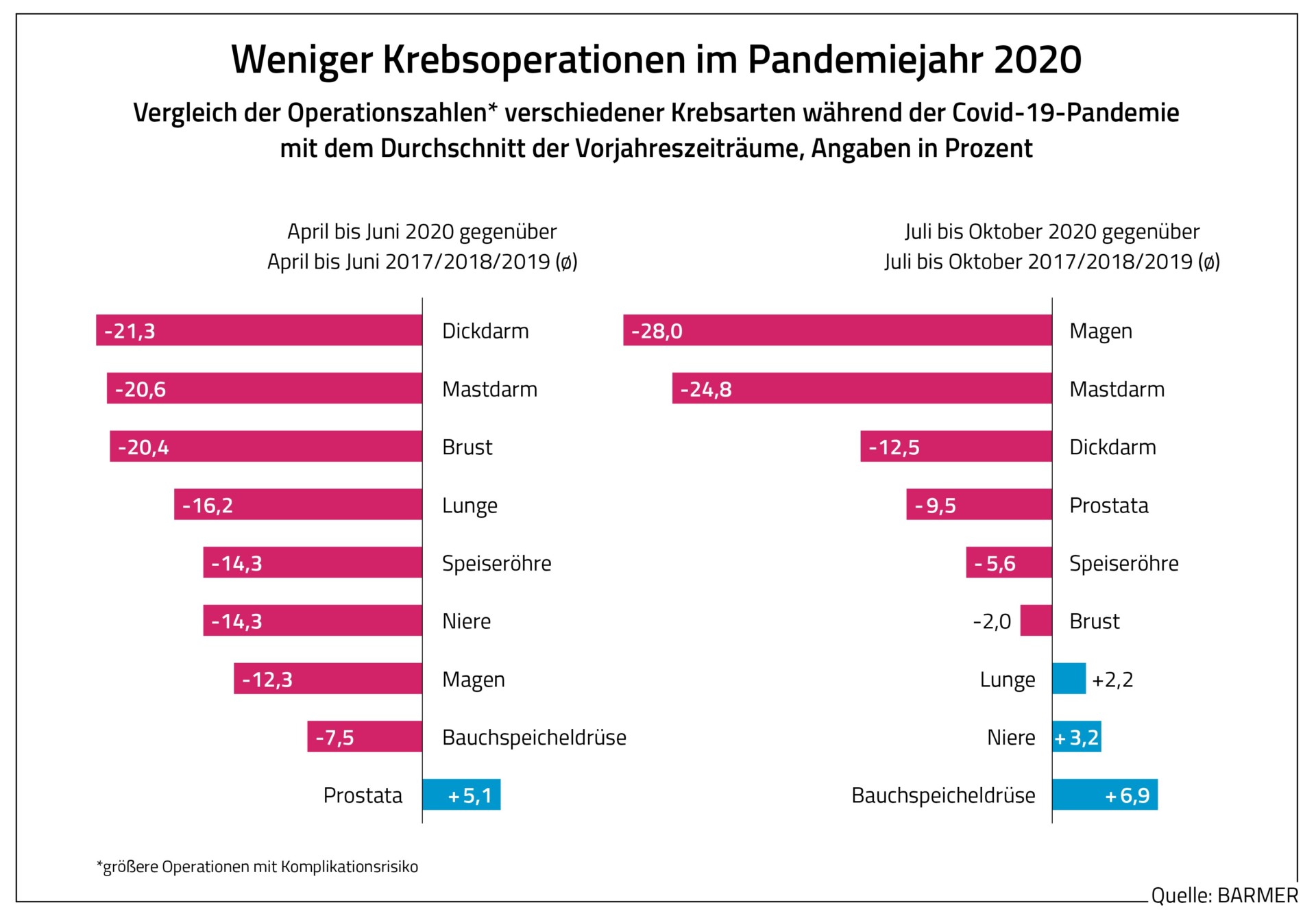 Aufgrund der Corona-Pandemie werden tausende Krebserkrankungen in Deutschland zu spät oder gar nicht entdeckt. Zu diesem Schluss kommt eine Analyse der BARMER, die die Anzahl größerer Operationen bei neun häufigen Krebserkrankungen während der Corona-Pandemie mit den passenden Zeiträumen aus den Vorjahren verglichen hat. So lag die Zahl der Eingriffe von April bis Juni vergangenen Jahres 16,7 Prozent unter denen der Vergleichszeiträume der Jahre 2017 bis 2019. Bei Brustkrebs, Mast- und Dickdarmkrebs betrug das Minus sogar mehr als 20 Prozent. In der ersten Corona-Welle dürften damit etwa 2.600 Krebserkrankungen unentdeckt geblieben sein, darunter fast 1.600 Brustkrebsfälle.