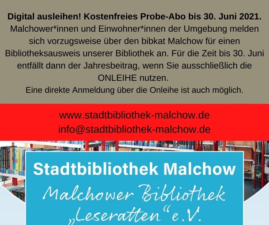 Wer in Malchow oder der Umgebung wohnt, wird gebeten, sich vorzugsweise über den bibkat Malchow für einen Bibliotheksausweis der Stadtbibliothek anzumelden. Die Mitarbeiter teilen dann die Zugangsdaten mit. Für die Zeit bis 30. Juni entfällt der Jahresbeitrag, wenn ausschließlich die ONLEIHE genutzt wird.