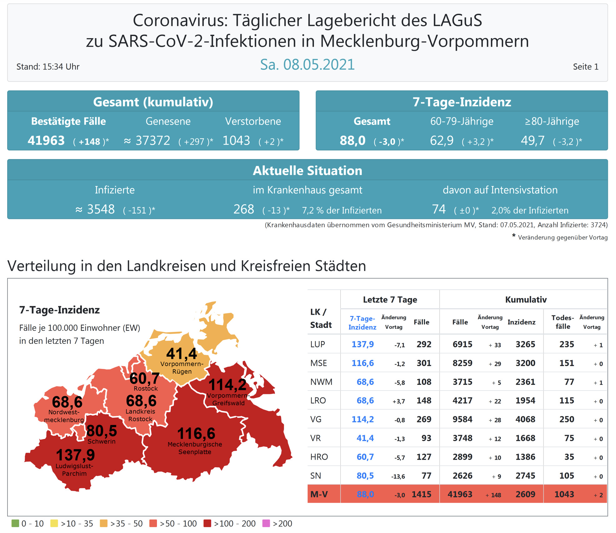Der Inzidenzwert für ganz Mecklenburg-Vorpommern ist ebenfalls gesunken und liegt heute bei 88,0 (gestern 91,0). Insgesamt meldet das Land Mecklenburg-Vorpommern heute 148 Neuinfektionen.