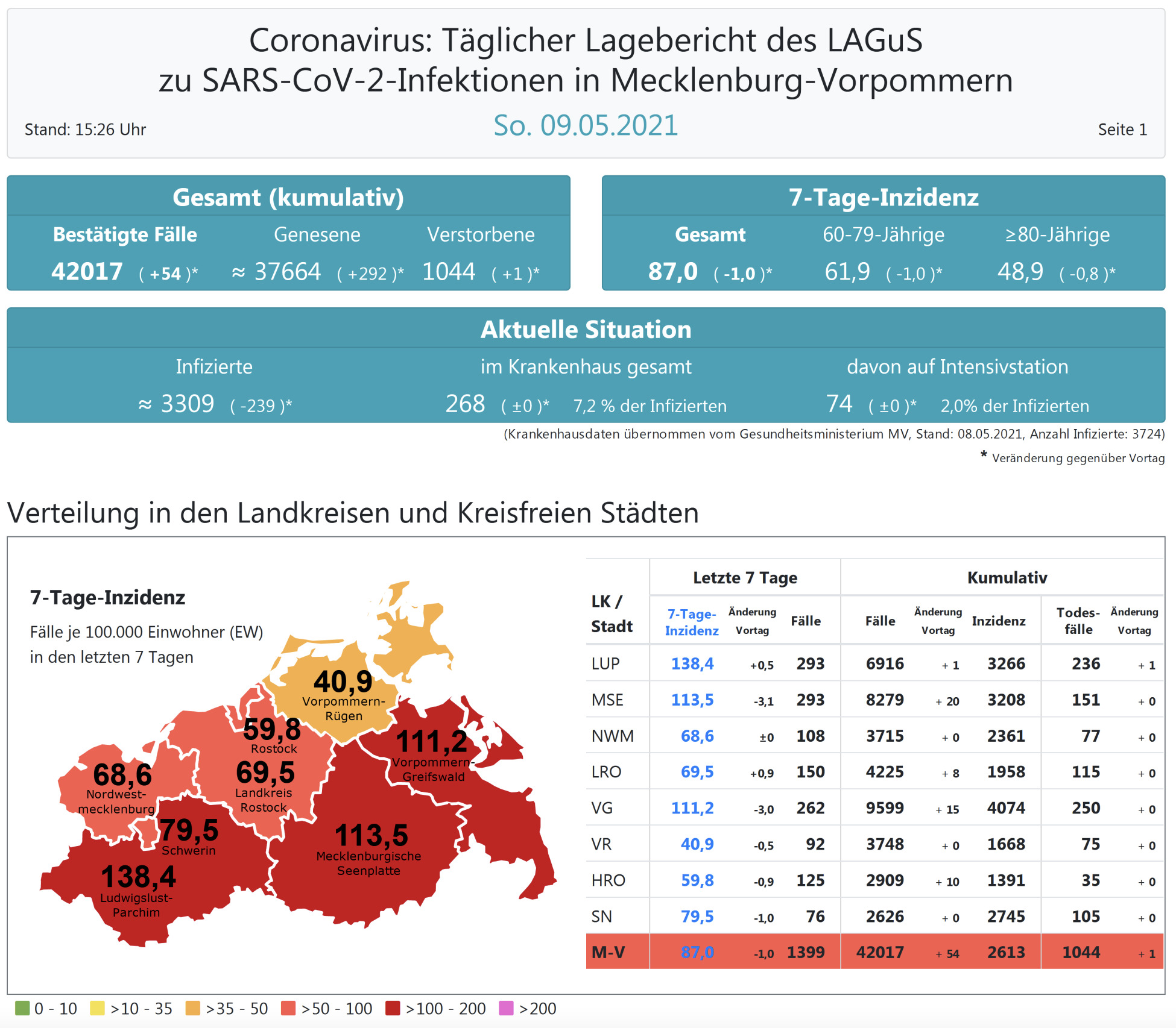 Der Inzidenzwert für ganz Mecklenburg-Vorpommern ist ebenfalls gesunken und liegt heute bei 87,0 (gestern 88,0). Insgesamt meldet das Land Mecklenburg-Vorpommern heute 54 Neuinfektionen.