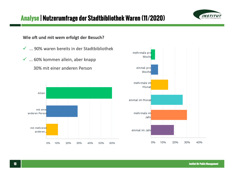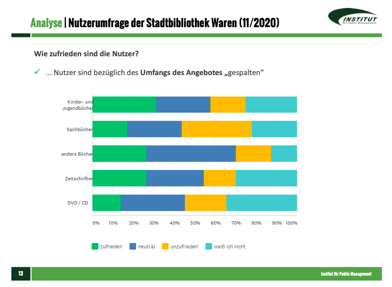 Und so ist es wenig verwunderlich, dass es nur sehr weniger junge Leser gibt, die sich Bücher oder andere Medien ausleihen. Die meisten Nutzer, nämlich 60 Prozent, sind zwischen 30 und 49 Jahre alt, gefolgt von den über 60-Jährigen mit 25 Prozent. Für die Schule und Ausbildung nutzt niemand der Befragten die Bibliothek, hauptsächlich werden persönliche Interessen als Grund für einen Besuch angegeben. Was das Angebot der Warener Bibliothek angeht, zeigen sich die „Kunden“ gespalten. Die größte Zufriedenheit gibt es mit den Kinder- und Jugendbüchern, die größte Unzufriedenheit beim Sachbücher-Angebot. Mit dem Personal dagegen sind die meisten Befragten zufrieden.