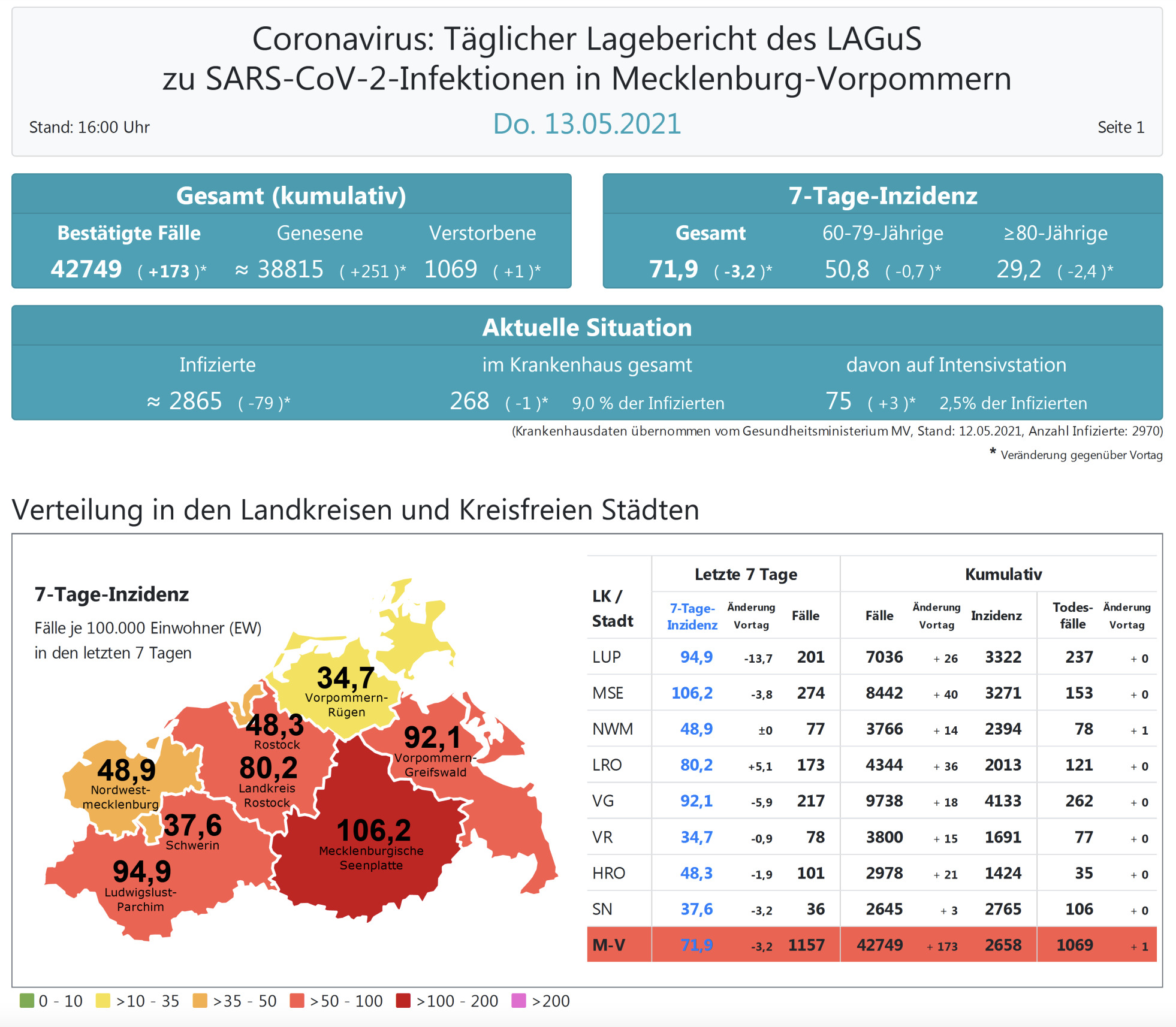 Der Inzidenzwert für ganz Mecklenburg-Vorpommern ist weiter gesunken und liegt heute bei 71,9 (gestern 75,1 ). Insgesamt meldet das Land Mecklenburg-Vorpommern heute 173 Neuinfektionen.