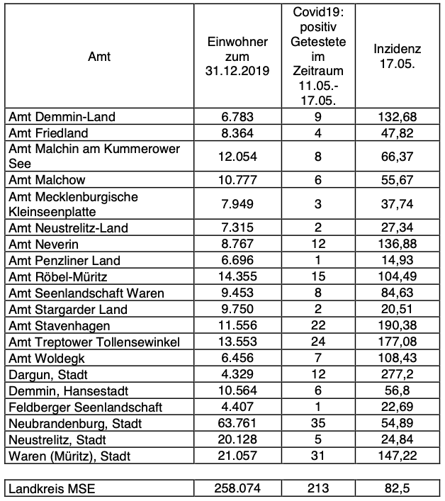 Dienstagnachmittag – Zeit für die aktuellen Inzidenzwerte der einzelnen Städte und Ämter im Landkreis Mecklenburgische Seenplatte. Die höchste Inzidenz verzeichnet derzeit das Amt Treptower Tollensewinkel mit 177,08. Das Amt Malchow meldet eine Inzidenz von 55,67, das Amt Penzliner Land von 14,93, das Amt Röbel-Müritz von 104,49, das Amt Seenlandschaft Waren von 84,63 und die Stadt Waren von 147,22.