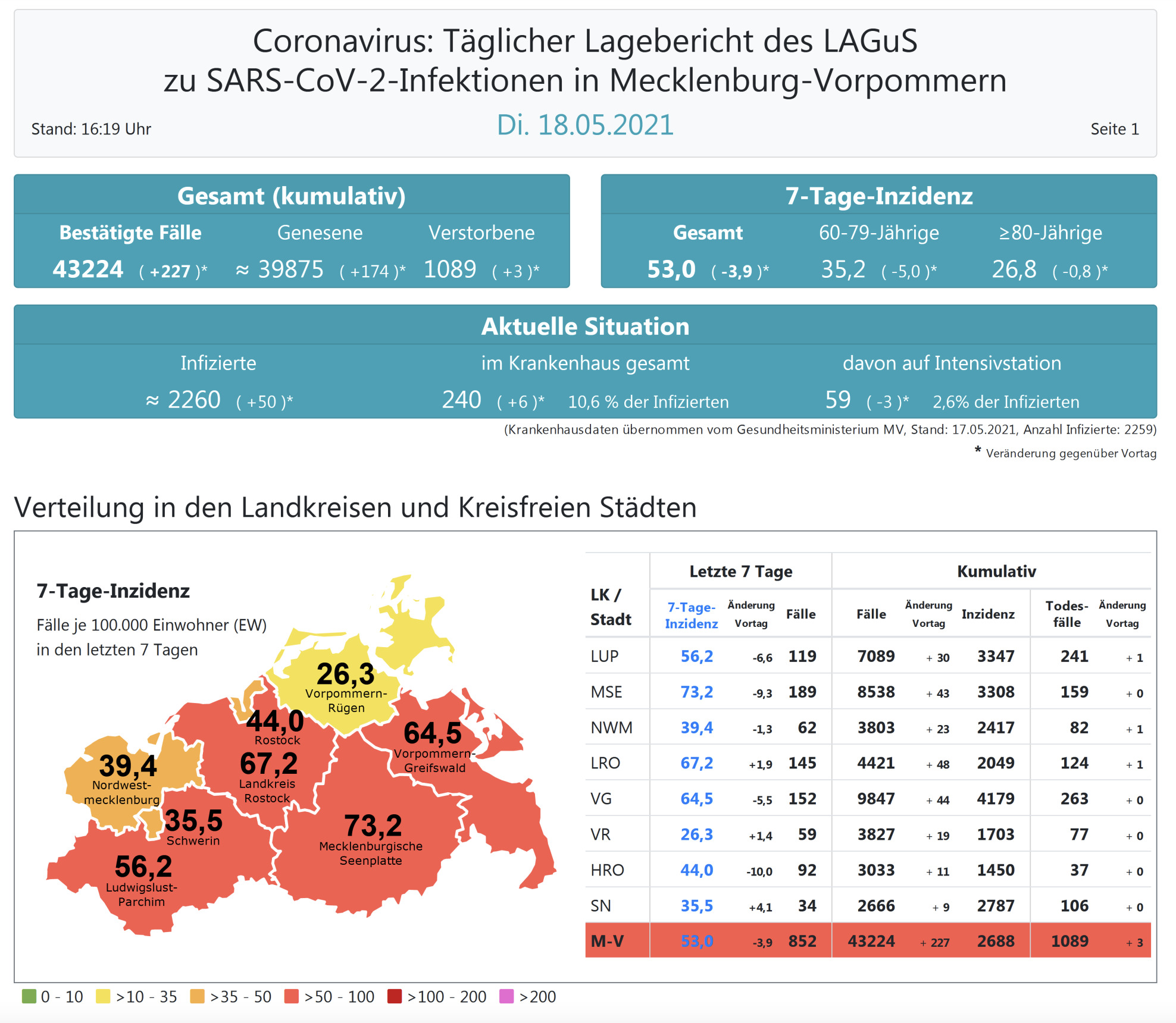 Der Inzidenzwert für ganz Mecklenburg-Vorpommern ist weiter gesunken und liegt heute bei 53,0 (gestern 56,9 ). Insgesamt meldet das Land Mecklenburg-Vorpommern heute 227 Neuinfektionen.