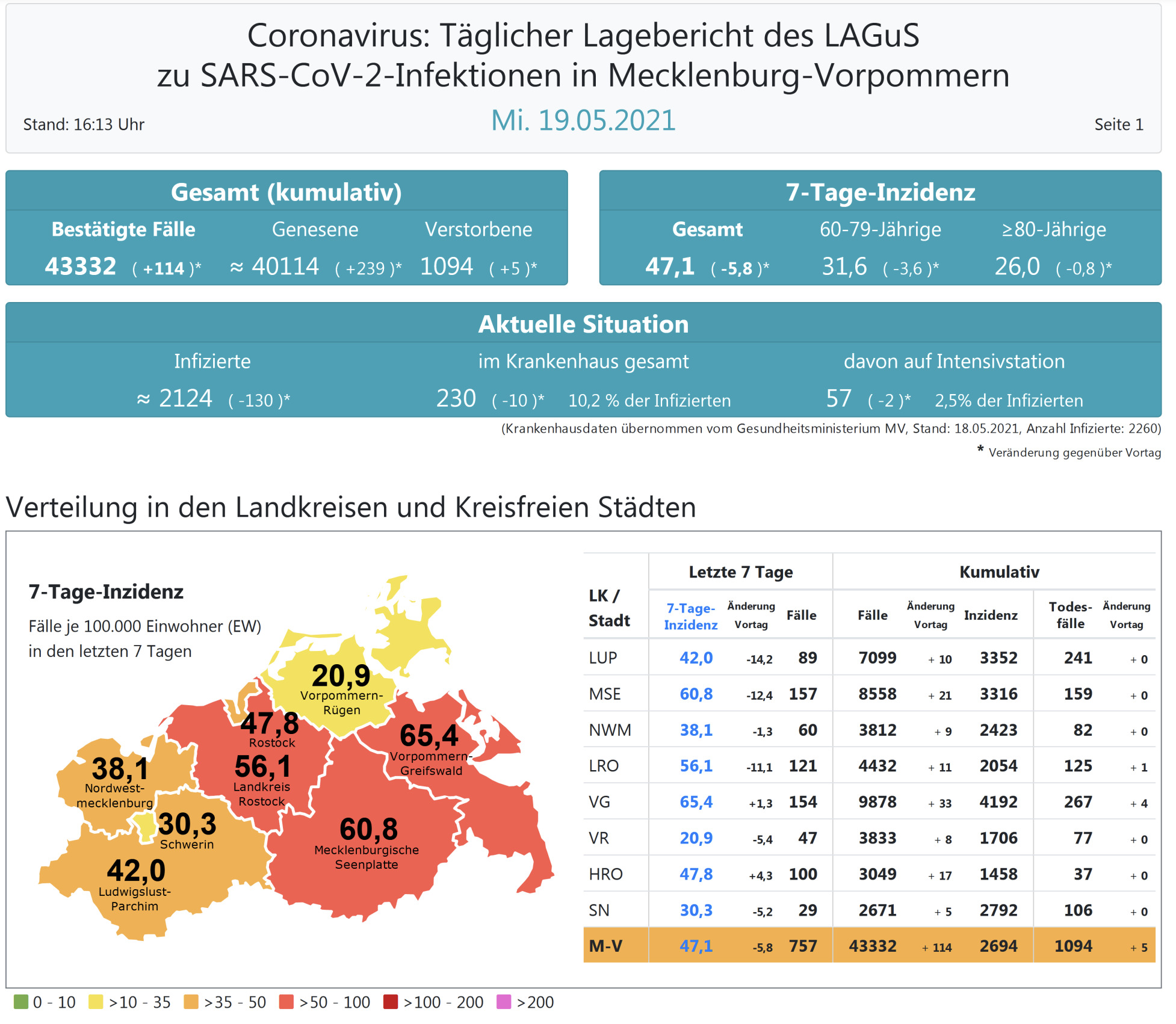 Er liegt heute bei 47,1 (gestern 53,0 ). Insgesamt meldet das Land Mecklenburg-Vorpommern heute 114 Neuinfektionen.