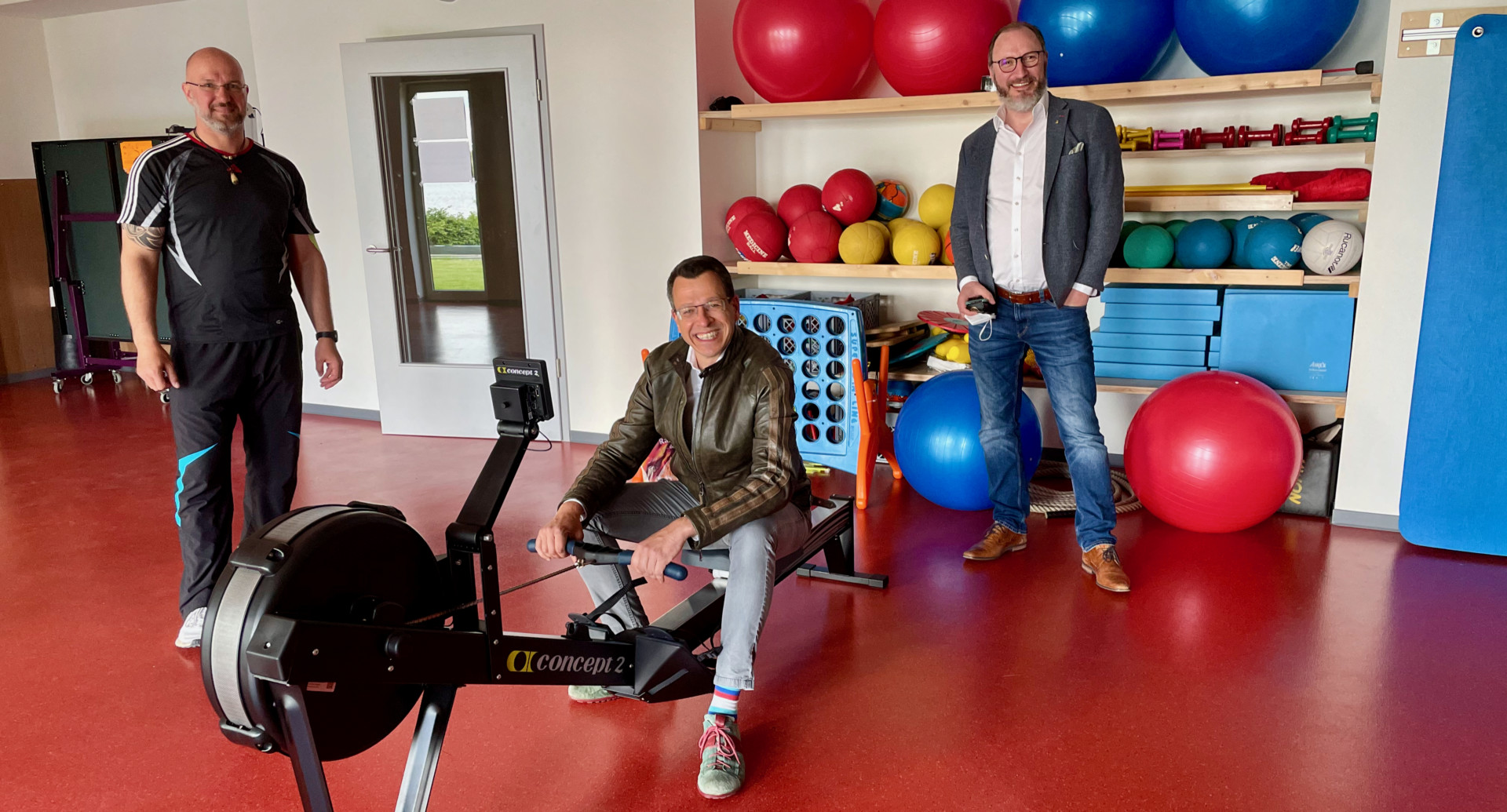 Foto: Dr. Felix Handy probiert das von ihm finanzierte Rudergerät selbst mal aus. Vereinsvorsitzender Reimo Boese und Trainer Kay Wehrmann freuen sich über die Neuanschaffung.