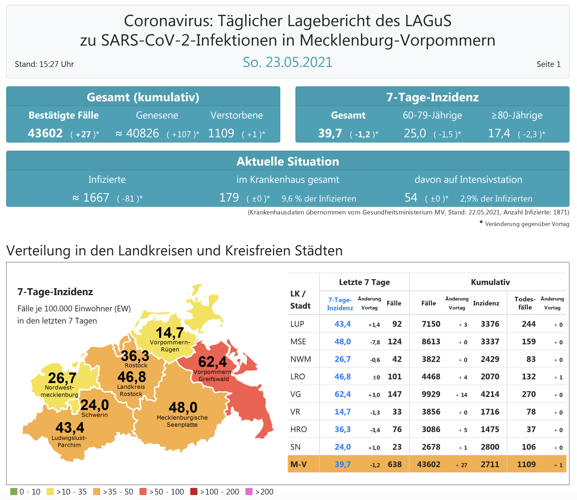 Der Inzidenzwert von ganz Mecklenburg-Vorpommern ist ebenfalls weiter gesunken. Er liegt heute bei 39,7 (gestern 40,9 ). Insgesamt meldet das Land Mecklenburg-Vorpommern heute 27 Neuinfektionen.