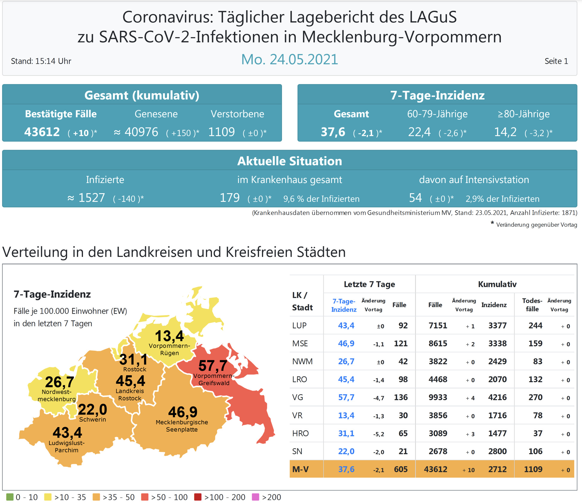Der Inzidenzwert von ganz Mecklenburg-Vorpommern ist ebenfalls weiter gesunken. Er liegt heute bei 37,6 (gestern 39,7 ). Insgesamt meldet das Land Mecklenburg-Vorpommern heute 10Neuinfektionen.