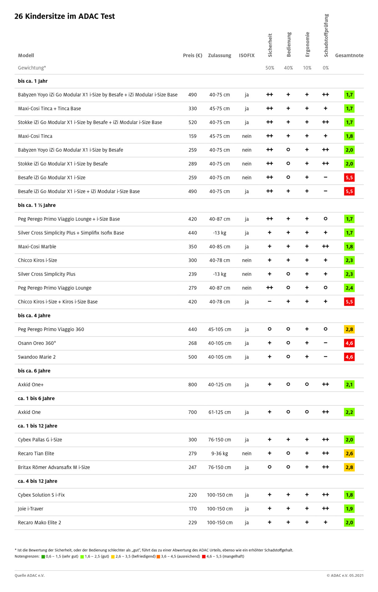 Im aktuellen Kindersitztest des ADAC wurden insgesamt 26 Kindersitze in den Kategorien Sicherheit, Bedienung, Ergonomie und Schadstoffgehalt geprüft und bewertet. Das Ergebnis: 18 Modelle schneiden mit „gut“ ab, drei mit „befriedigend“. Damit übertreffen diese Sitze die gesetzlichen Vorschriften zum Teil deutlich. Aber es gab auch Verlierer: Fünf Kindersitze konnten nur mit „mangelhaft“ bewertet werden. Dabei scheiterten vier an den strengen Kriterien der Schadstoffprüfung, einer versagte beim Frontal- und Seiten-Crash.