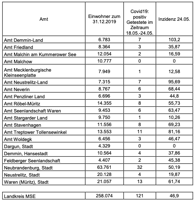 Auch am heutigen Dienstag hat der Landkreis Mecklenburgische Seenplatte wieder die Inzidenzen der Städte und Ämter veröffentlicht. Die höchste Inzidenz hat demnach das Amt Demminer Land mit 103,2. Das Amt Malchow meldet eine Inzidenz von 0, das Amt Penzliner Land von 44,8, Das Amt Röbel-Müritz von 55,73, das Amt Seenlandschaft Waren von 63,47 und die Stadt Waren von 61,74.