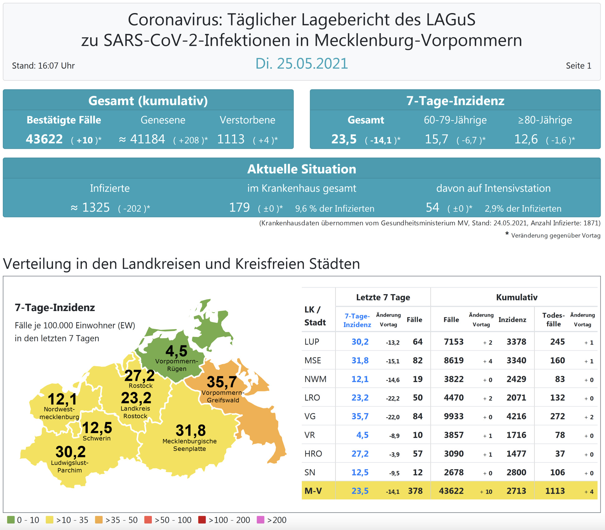 Der Inzidenzwert von ganz Mecklenburg-Vorpommern ist ebenfalls weiter gesunken. Er liegt heute bei 23.5 (gestern 37,6 ). Insgesamt meldet das Land Mecklenburg-Vorpommern heute 10 Neuinfektionen.