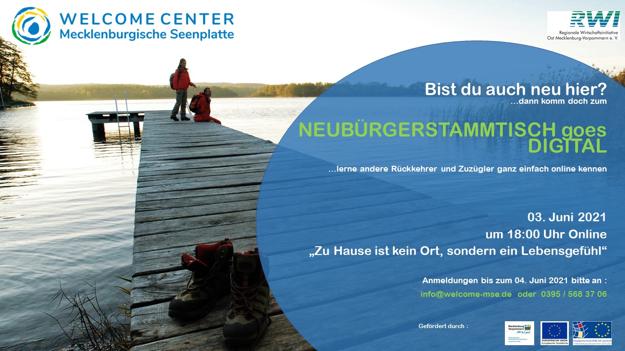 Das ESF-geförderte und von der RWI Regionalen Wirtschaftsinitiative Ost M-V e.V. getragene Welcome Center Mecklenburgische Seenplatte lädt zum 14. Stammtisch für Zuzügler und Heimkehrer.