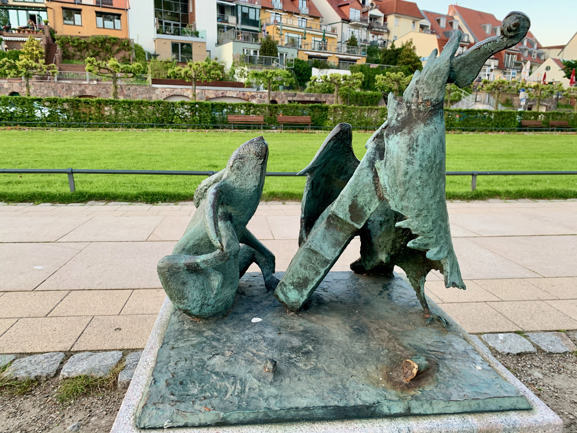 Die Skulptur ist übrigens die plastische Umsetzung des traurig-tragischen Hasenschicksals aus „Lütt Matten, de Has“. Die Bronzeskulptur wurde nach einer plattdeutschen Fabelgeschaffen. In dem Melodram tanzte der kleine Hase auf seinen achtersten allein auf einer Wiese (hinterste Pfoten = Padden). Da kam Reinecke Fuchs (Reinke de Voß) und überredete Lütt Matten, zusammen zu tanzen. Die Krähe sollte die Fiedel spielen, dann „geiht dat kandidel“. Kaum geschehen, beißt der Fuchs den leichtgläubigen Hasen tot und verspeist ihn. Die falsche Krähe spielte zum Tanz und bekam ihren Anteil an der Beute „ein, von die achtersten Bein“.
