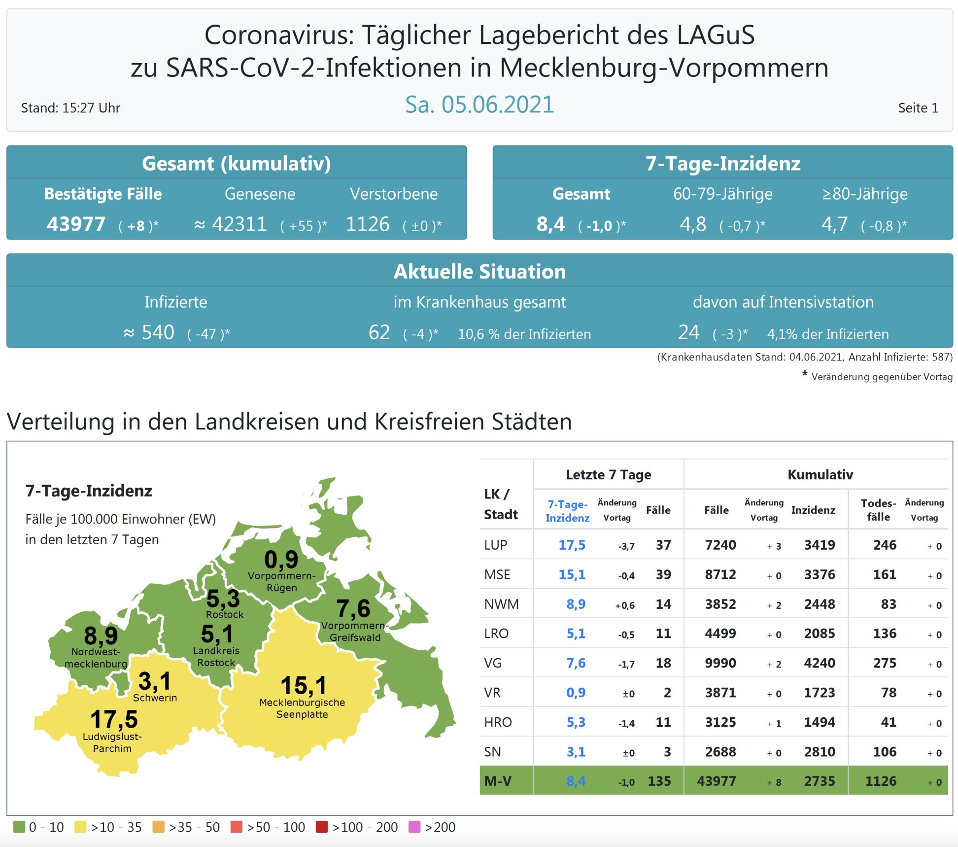 Der Inzidenzwert von ganz Mecklenburg-Vorpommern ist ebenfalls gesunken. Er wird heute mit 8,4 (gestern 9,4 ) angegeben. Insgesamt meldet das Land Mecklenburg-Vorpommern heute 8 Neuinfektionen.