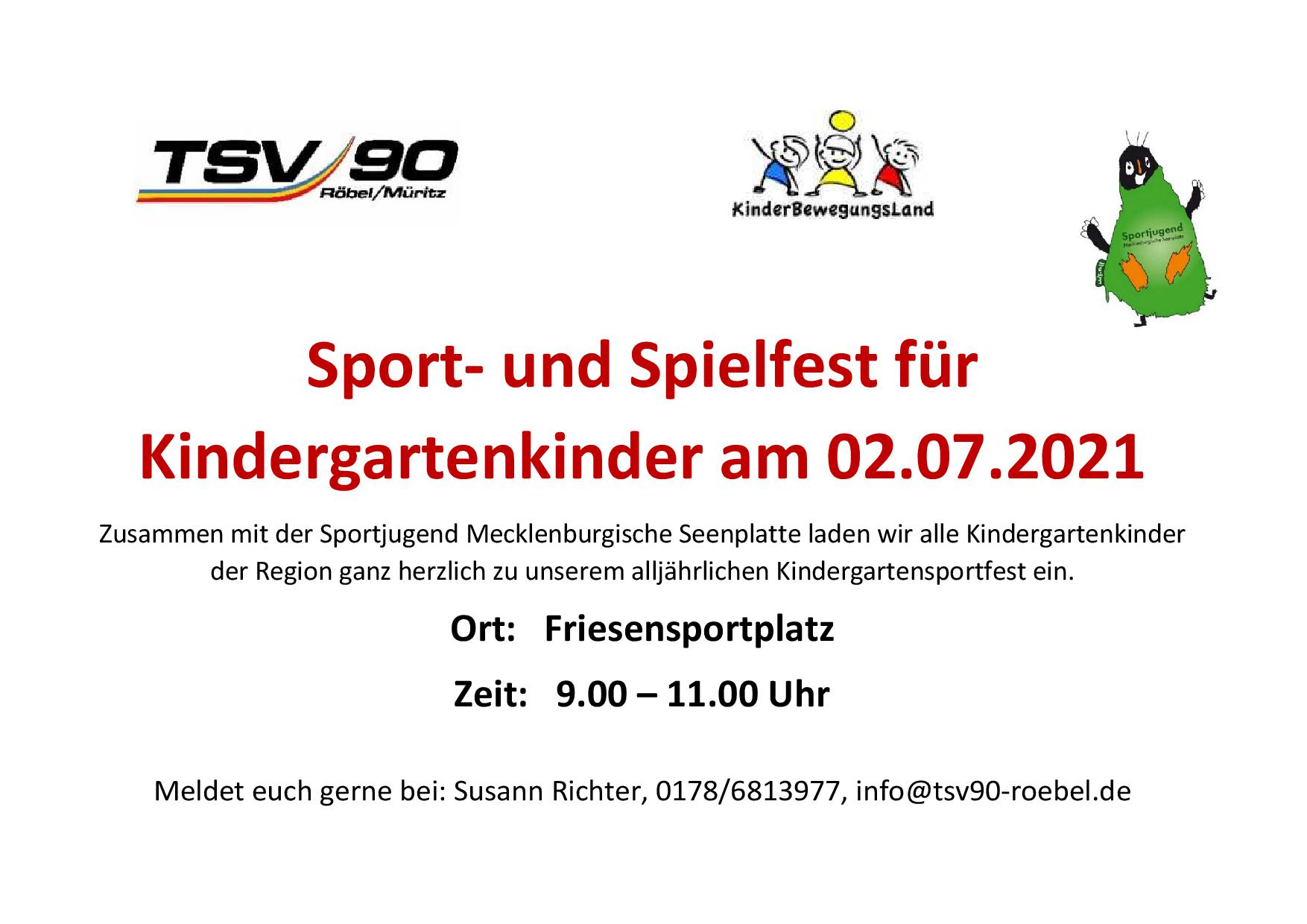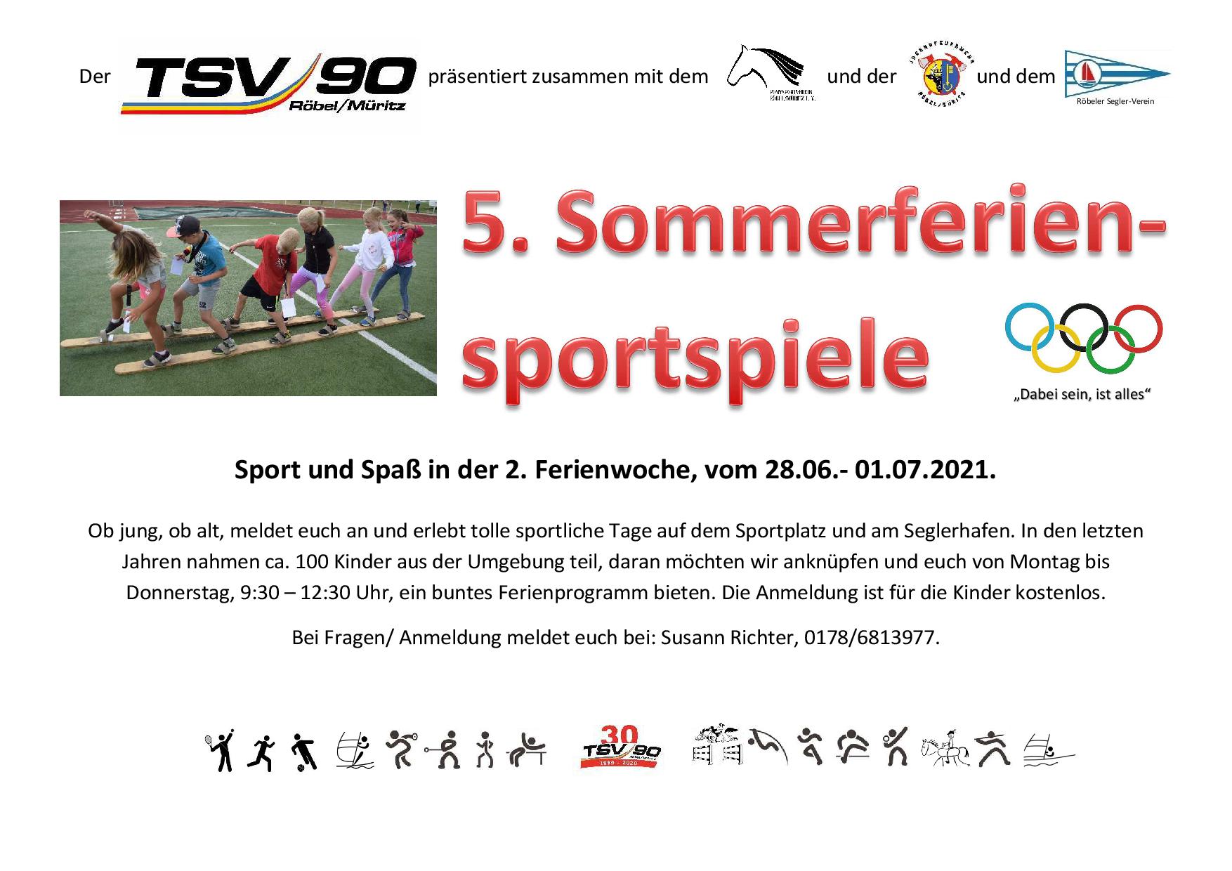 Von 9.30 bis 12.30 Uhr bietet der TSV 90 ein buntes Ferienprogramm. In diesem Jahr mit dabei, die Feuerwehr Röbel, der Ponysportverein und der Röbeler Segelverein. „Am Freitag, 2. Juli, runden wir dann unser sportliche Woche mit dem alljährlichen Kindergartensportfest ab. Dieses findet normalerweise im Februar statt, aber aufgrund der bekannten Umstände haben wir es in diesem Jahr in den Sommer geschoben. Wir freuen uns auf alle Kitakinder und auch wenn die Kita zu hat, dann können sie ihre Kinder auch gern individuell anmelden, wir haben genug Helfer vor Ort. Wer dabei sein möchte kann sich gerne unter info@tsv90-roebel.de oder 0178/6813977 melden“, so Susann Richter vom TSV 90.