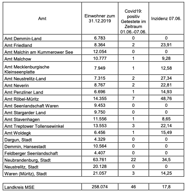 Heute gibt’s wieder die Inzidenzwerte der einzelnen Städte und Ämter der Mecklenburgischen Seenplatte. Und die sehen recht erfreulich aus – gleich achtmal steht in der Statistik eine 0. Das Amt Malchow meldet eine Inzidenz von 9,28, das Amt Penzliner Land von 14,93, das Amt Röbel-Müritz von 48,76, das Amt Seenlandschaft Waren von 0 und die Stadt Waren von 14,25.