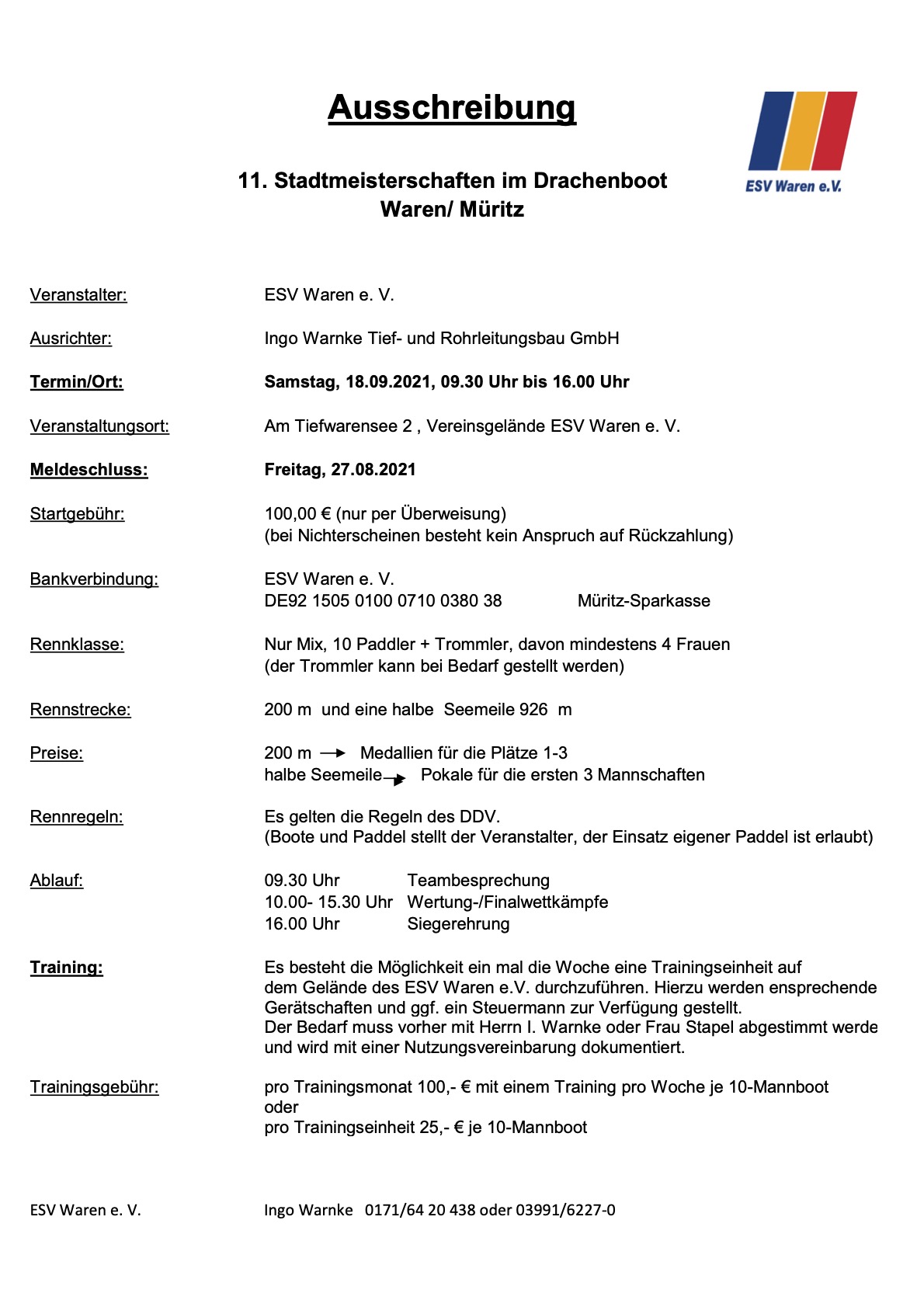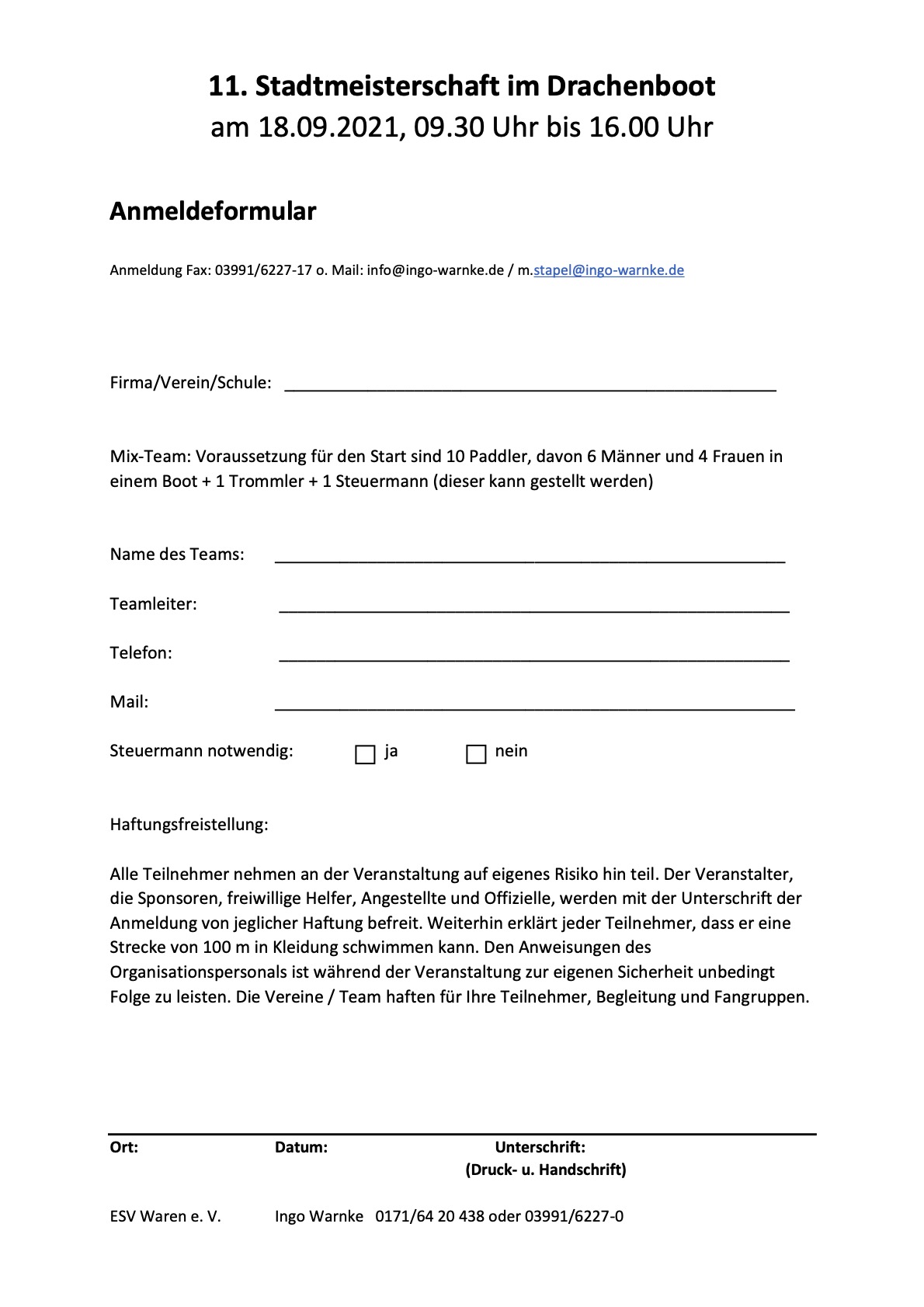 Der ESV bietet im Vorfeld Trainingseinheiten an. Anmeldungen bitte per Mail an Ingo Warnke info@ingo-warnke.de. Firmen bzw. Vereine, die keine eigene Mannschaft bilden können, können zu einem Team zusammenführt werden.