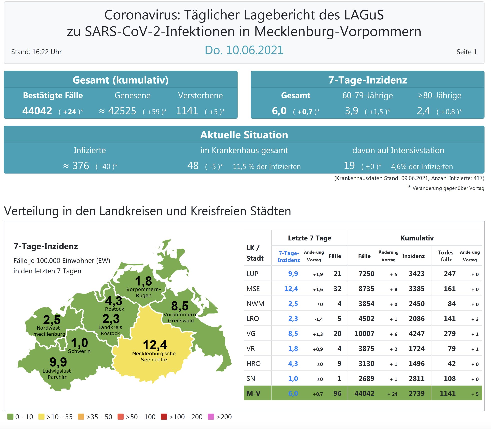 Der Inzidenzwert von ganz Mecklenburg-Vorpommern ist ebenfalls leicht gestiegen. Er wird heute mit 6,0 (gestern 5,3 ) angegeben. Insgesamt meldet das Land Mecklenburg-Vorpommern heute 24 Neuinfektionen.