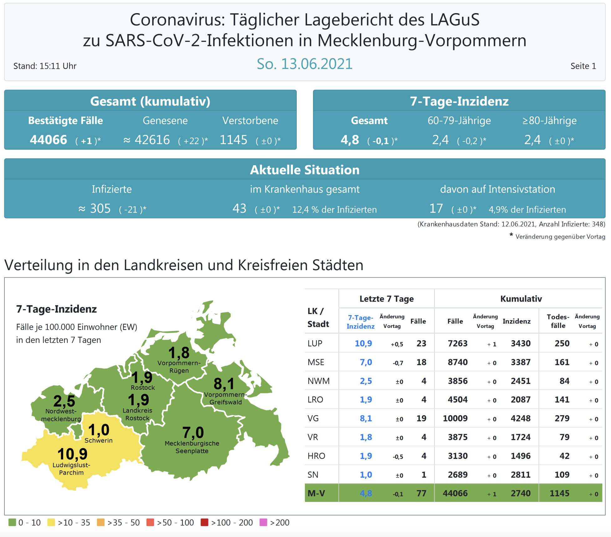 Der Inzidenzwert von ganz Mecklenburg-Vorpommern ist leicht gesunken. Er wird heute mit 4,8 (gestern 4,9 ) angegeben. Insgesamt meldet das Land Mecklenburg-Vorpommern heute 1 Neuinfektion.