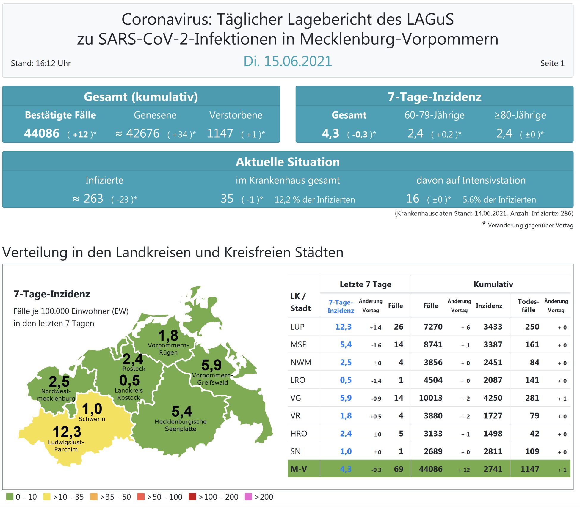 Der Inzidenzwert von ganz Mecklenburg-Vorpommern ist ebenfalls gesunken. Er wird heute mit 4,3 (gestern 4,6 ) angegeben. Insgesamt meldet das Land Mecklenburg-Vorpommern heute 12 Neuinfektionen.