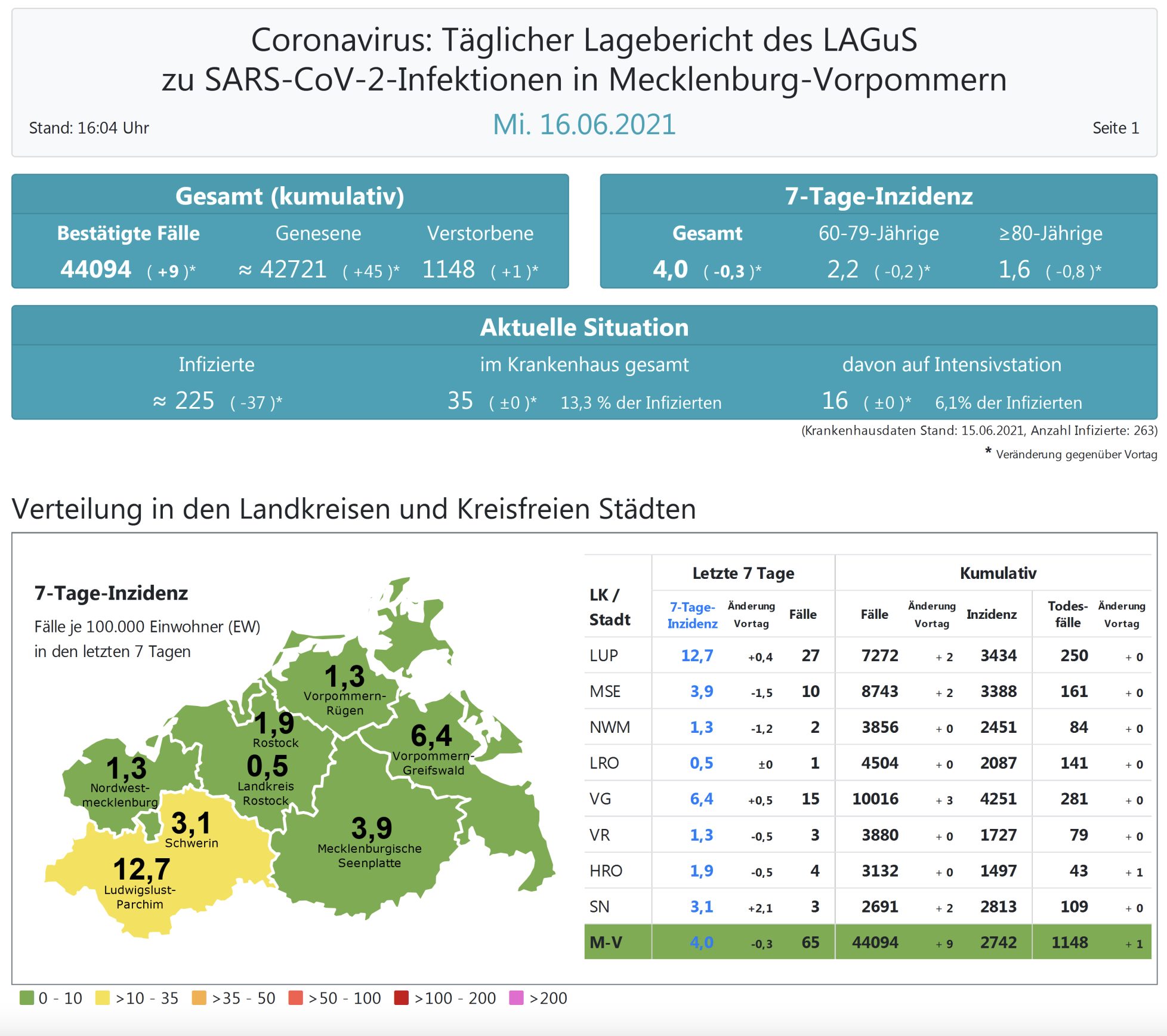 Der Inzidenzwert von ganz Mecklenburg-Vorpommern ist ebenfalls gesunken. Er wird heute mit 4,0 (gestern 4,3 ) angegeben. Insgesamt meldet das Land Mecklenburg-Vorpommern heute 9 Neuinfektionen.