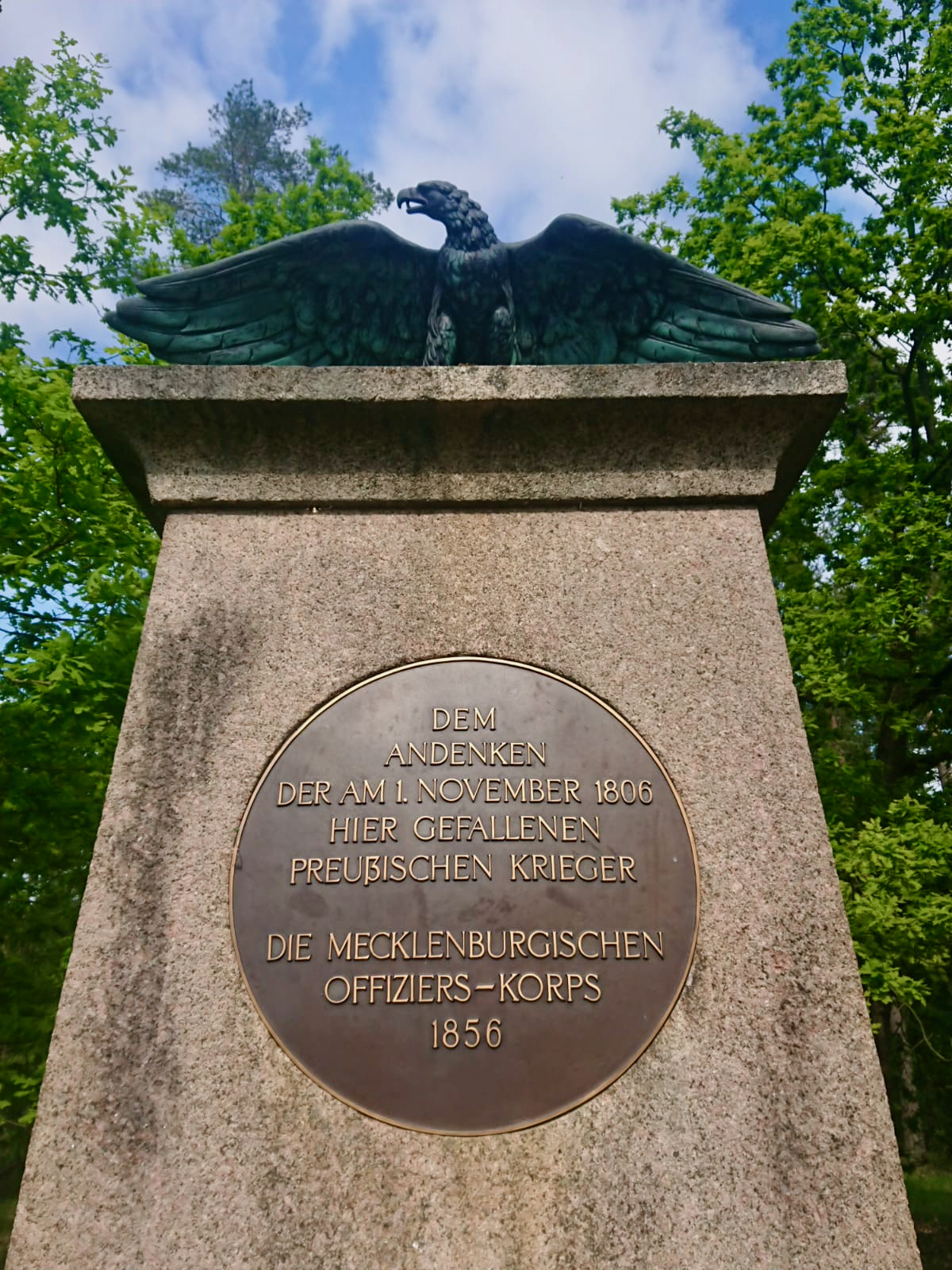 Offen erinnert dort nichts an das Drama des 27 Jahre alten Unglückspiloten aus Mecklenburg. Doch es gibt ja ein Militärdenkmal, das an einen Kampf gegen napoleonische Krieger erinnert. Es wurde 50 Jahre später, 1856, geschaffen, trägt die passende Inschrift „Ehre den auch im Unglück Unverzagten“ und zur Einweihung kam damals auch der Großherzog aus Schwerin.