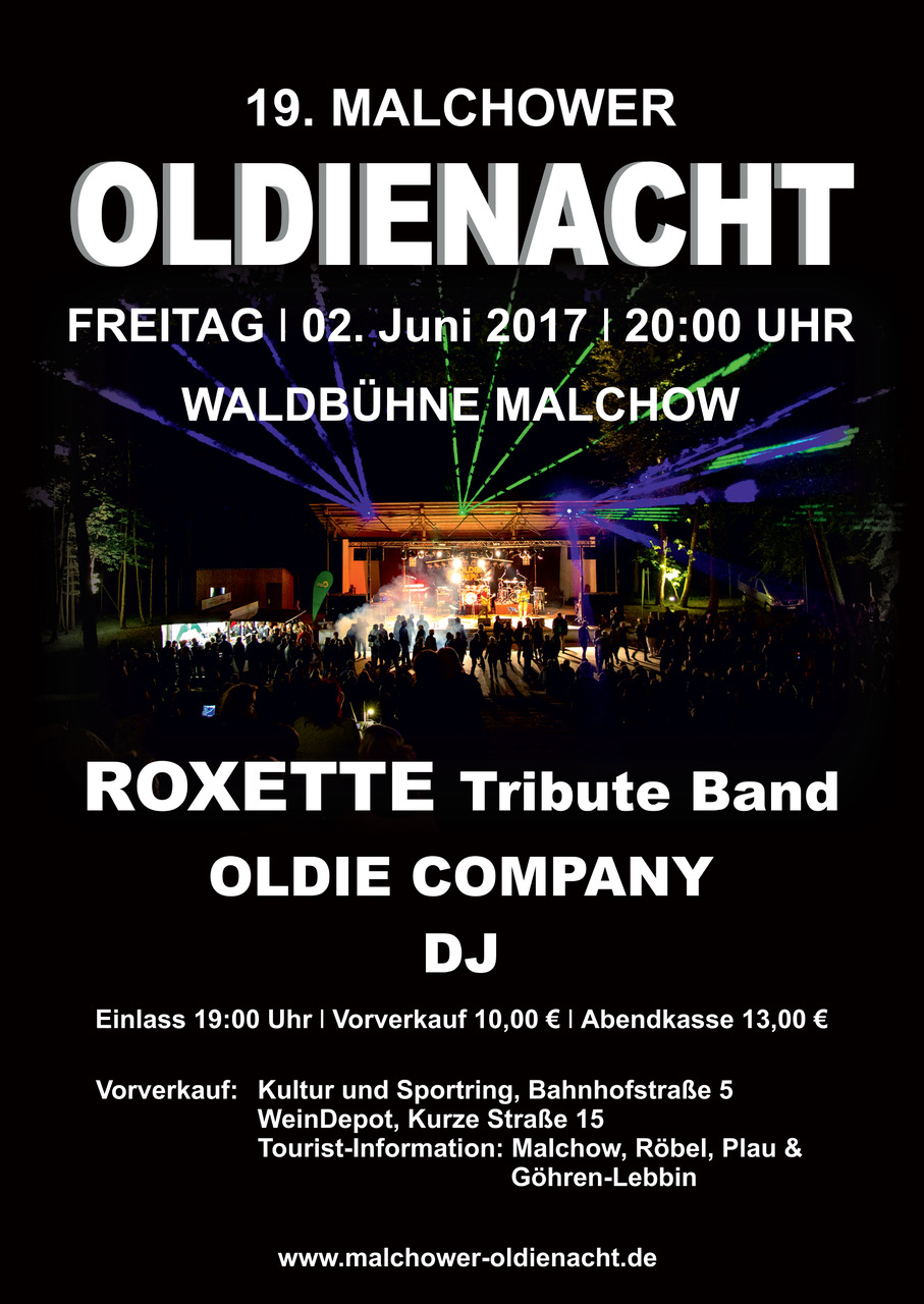 Bereits zum 19. Mal startet am „Pfingstfreitag“, also am 2. Juni, die „Malchower Oldienacht“ auf der Waldbühne, die jetzt vom Musik- & Kunstverein Inselstadt Malchow veranstaltet wird und viele Anhänger auch außerhalb Malchows hat. In diesem Jahr will die „Roxette Tribute Band Roxanne“ für Stimmung sorgen, Karten sind bereits im Vorverkauf erhältlich.