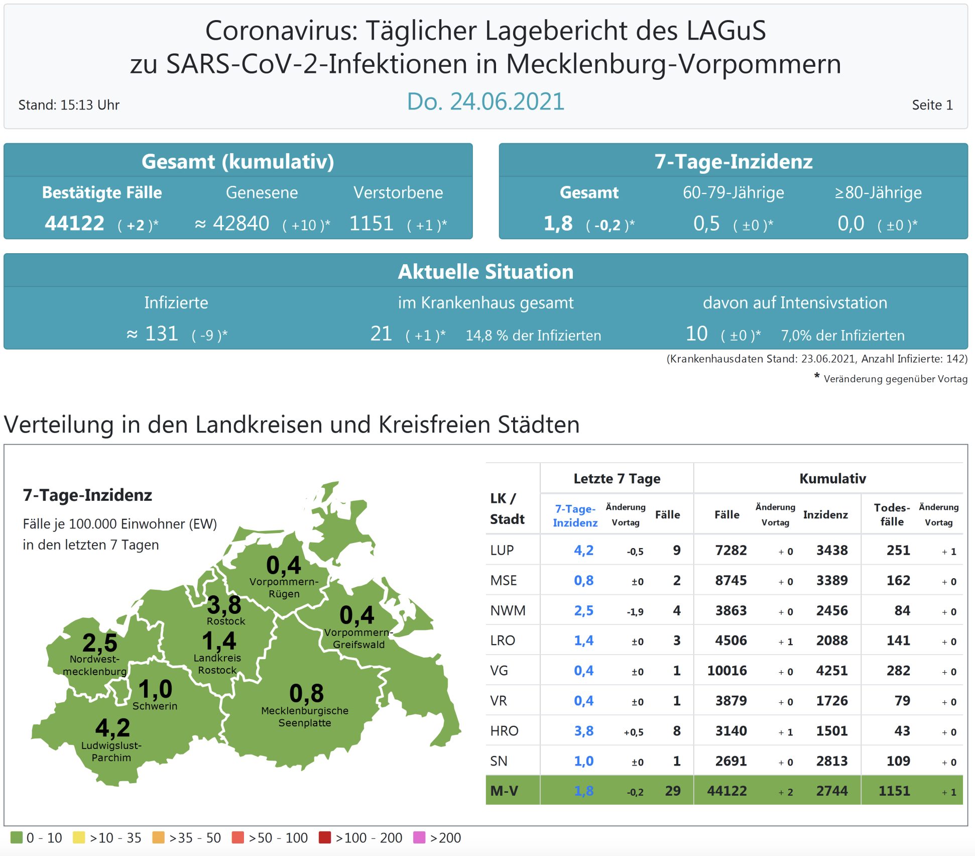 Der Inzidenzwert von ganz Mecklenburg-Vorpommern ist weiter gesunken. Er wird heute mit 1,8 (gestern 2,0 ) angegeben. Insgesamt meldet das Land Mecklenburg-Vorpommern heute 2 Neuinfektionen.