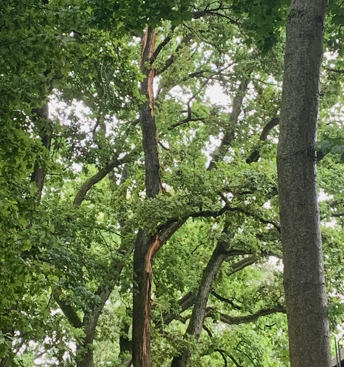 „Vom Baum ist die Rinde an der Stelle runter, der Blitz ist dann in die Erde und über den Nulleiter und unseren zentralen Hausanschlusskasten. Und der fing dann an zu brennen“, berichtet Nils Düwell. Glücklicherweise war der Kasten mit einer Brandschutztür ausgestattet, so dass die Flammen schnell erstickten, doch die Elektrik ist hin.