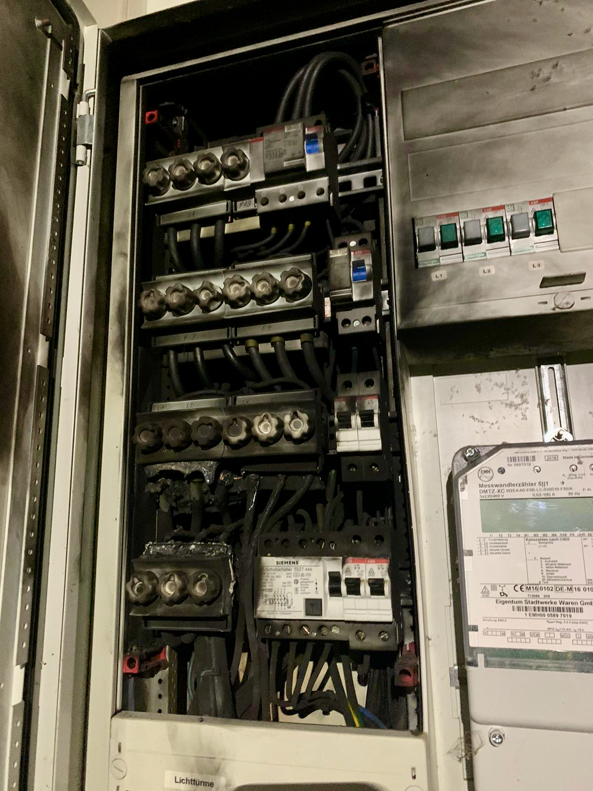 Das ist ein typisches Bild nach einem Blitzeinschlag in der Nähe. Um das zu vermeiden, müsste ein innerer Blitzschutz vorgesehen werden, der aber nur von Experten richtig installiert werden kann, nicht von jedem Elektromeister, auch wenn sie das meistens dürfen. Denn das ist beispielsweise so kompliziert, weil wir es mit Impulsströmen im mehrere 100 Kiloamperebereich zu tun haben, denen schon eine Viertelbiegung eines Leiters einen entscheidenden induktiven Widerstand entgegensetzt, so dass die Energie nicht Richtung Erde über einen niederohmigen Erder abgeleitet wird. Dazu kommen induktive Beeinflussungen von parallel verlaufenden Leitungen und mit entgegengesetzter Stromrichtung und Spannungsspitzen an deren höchsten Punkt (z.B. Antennenverstärker unter dem Dach). Übrigens hilft dagegen der höchste Blitzableiter nicht, im Gegenteil, er zieht Blitze an und dann hat das solche Folgen, aus der Erde, von unten kommend. Der innere Blitzschutz kostet ab 200 Euro zusätzlich (das Gerät ab 60 Euro+Montage), kann aber mehr als 1000 Euro teuer werden, wenn eine zusätzliche Erdung hergestellt und ein weiterer „Stromkasten“ im Keller installiert werden muss. Wenig Geld, wenn man das damit vergleicht, den Schaden zu beseitigen. Es ist aber viel Geld, wenn wir die Wahrscheinlichkeit des Blitzschadens einkalkulieren und dass auch der beste äußere und innere Blitzschutz nicht in jedem Fall hilft, alle Schäden zu vermeiden. Es ist also Abwägungssache. Auf der Waldbühne würde ich wegen der exponierten Lage dazu raten, eher mehr als weniger in den Blitzschutz zu investieren.