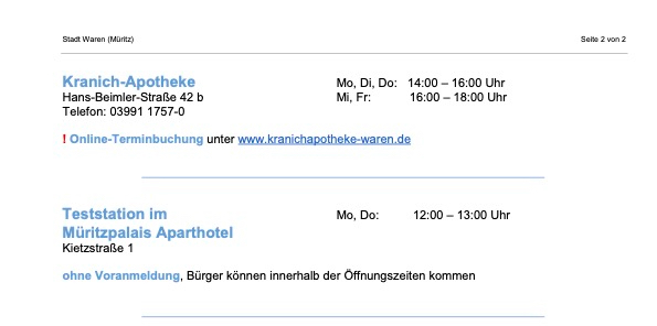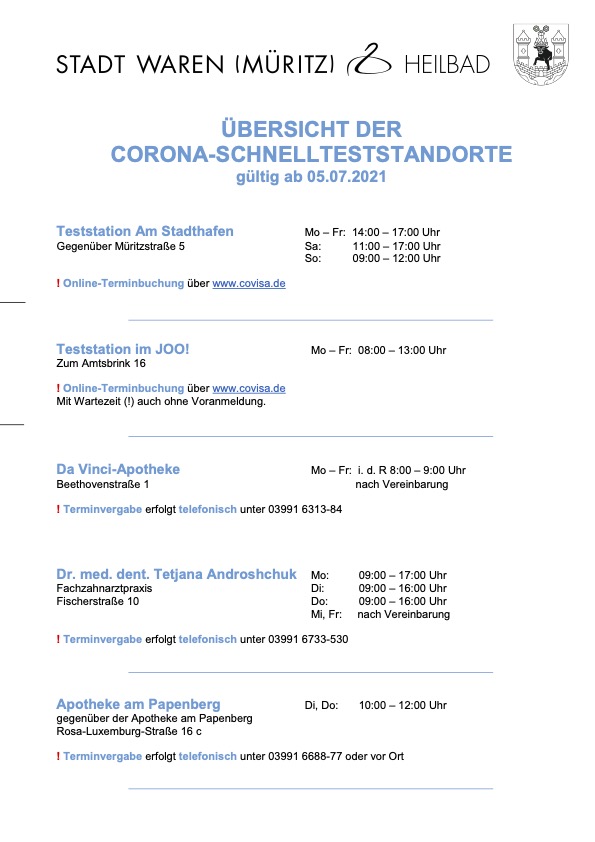 Die Stadt Waren hat die Übersicht über die jetzt vorhandenen Schnelltest-Zentren in der Stadt aktualisiert. Hier ist der Überblick: