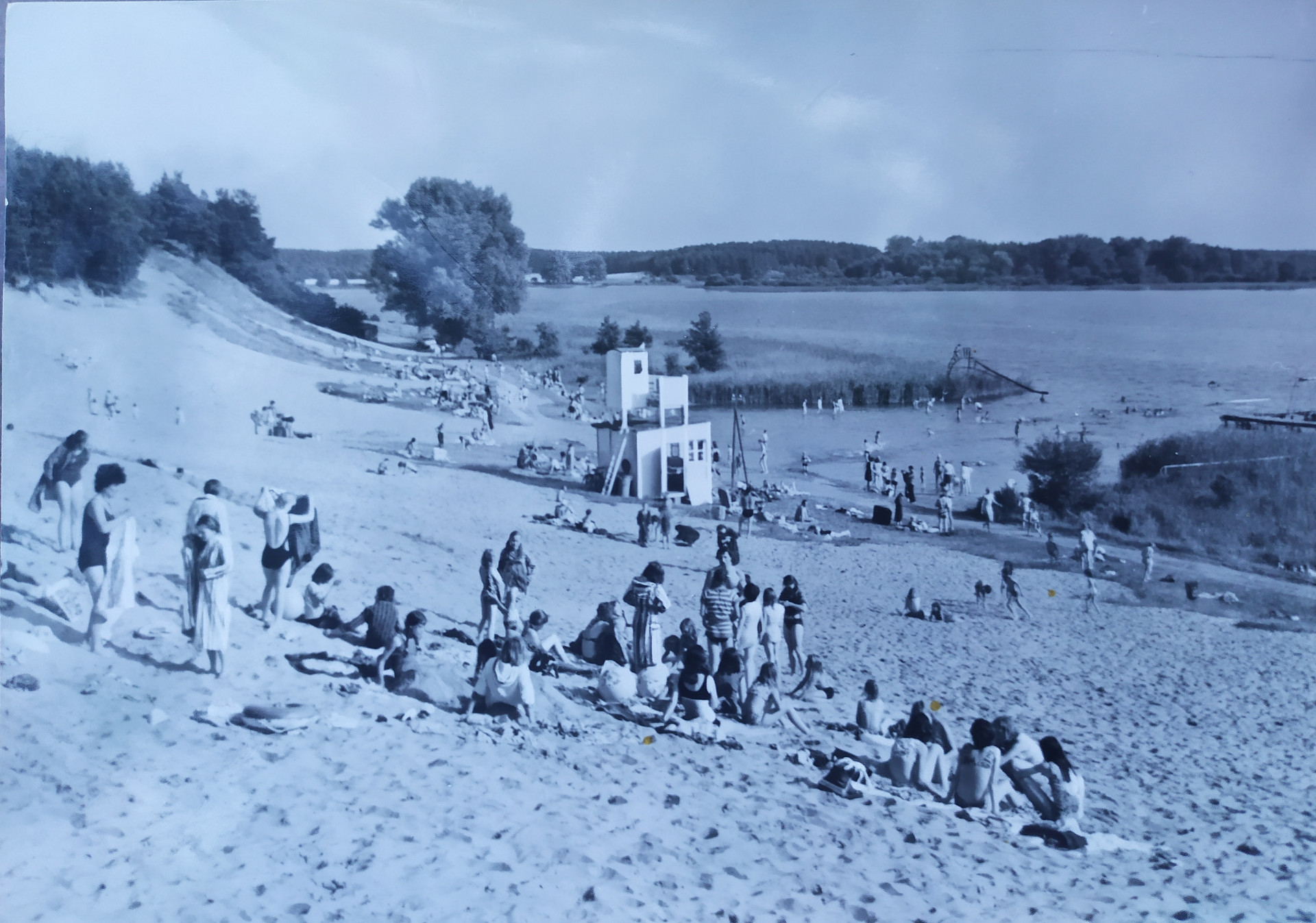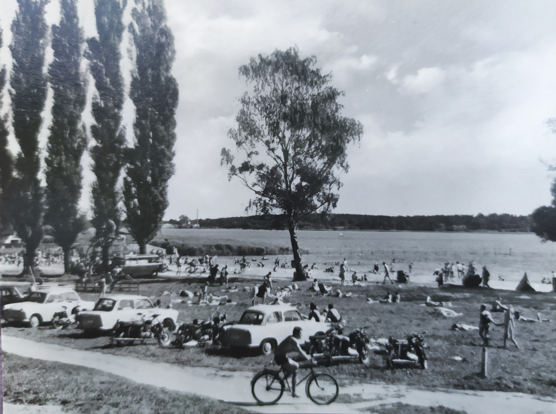 Das Volksbad-Foto stammt aus der Zeit, als es noch keinen Zaun gab und man sich nicht sorgen brauchte, wenn 3 Trabbis und ein ganz sicher volkseigener Barkas B 1000 direkt auf der Wiese parkten. Auf dem Foto ist auch einer der beiden Sputnik-Klettergerüste erkennbar. Die waren überaus beliebt, aber auch kreuzgefährlich, weil man von oben auf Gerüstteile darunter krachen konnte. Nicht zu sehen: Es gab weiter westlich Standkörbe, am Eingang Stadtseite einen riesigen Kiosk, auch mit endlos vielen Badeutensilien, alle für ein paar DDR-Mark und einen weiteren Imbiss, beide mit Stühlen und Tischen, außerdem die Gaststätte wie jetzt, ein 1m und ein 3m Sprungbrett und eine Schwimmstrecke zwischen den Stegenden.