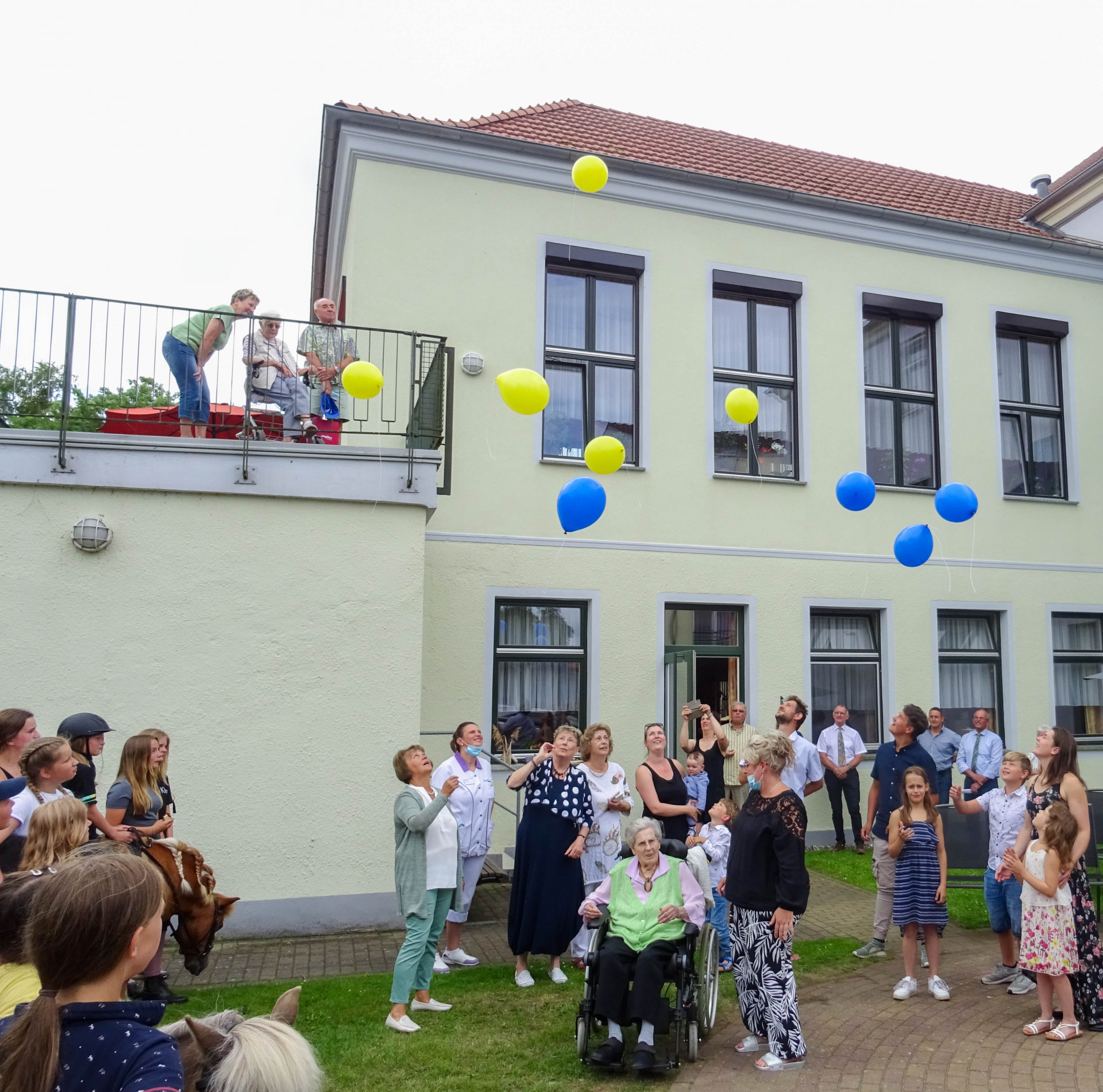 Die Freude über einen Besuch des Röbeler Ponysportvereines war groß, als sich dessen Mitglieder zum Gratulieren mit einem Geburtstagsständchen einfanden. Die Ponys wurden im Vorfeld passend zum Jubiläum geschmückt. Musikalisch sorgte das Bläserduo Fabisch und Schwörk für gute Laune. Nachdem das „Mecklenburger Heimatlied“ erklungen war, zu dem auch alle Gäste lautstark mitsangen, wurden 100 Luftballons in den Röbeler Himmel über der Müritz auf die Reise geschickt. „Wir danke allen Gästen und dem gesamten Team für diesen unvergesslichen Tag“, freute sich die Tochter der Jubilarin, Hannerlore Helmes.