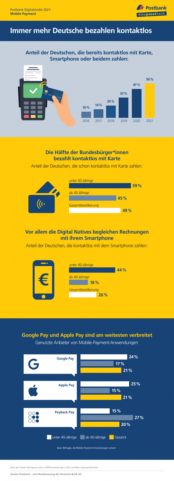 Die Corona-Krise hat modernen Bezahlmethoden einen Schub verliehen: 56 Prozent der Bundesbürger*innen begleichen Rechnungen bereits kontaktlos mit ihrer Bankkarte, mit dem Smartphone (Mobile Payment) oder mit beidem. Im Vorjahr waren es erst 47 Prozent, vor fünf Jahren sogar nur zehn Prozent. Dies sind Ergebnisse der repräsentativen Postbank Digitalstudie 2021. Beide Technologien nutzen die Deutschen vor allem aus Bequemlichkeit. Jeder zweite Mobile-Payment-Anwender und zwei von drei Kartennutzern finden die verwendete Methode einfacher und schneller als Bargeld. Ein weiterer Vorteil ist das geringere Infektionsrisiko: 39 Prozent der Mobile-Payment-Anwender und 47 Prozent der Kartennutzer bezahlen so, weil sie Corona-bedingt weniger mit Scheinen und Münzen hantieren möchten.