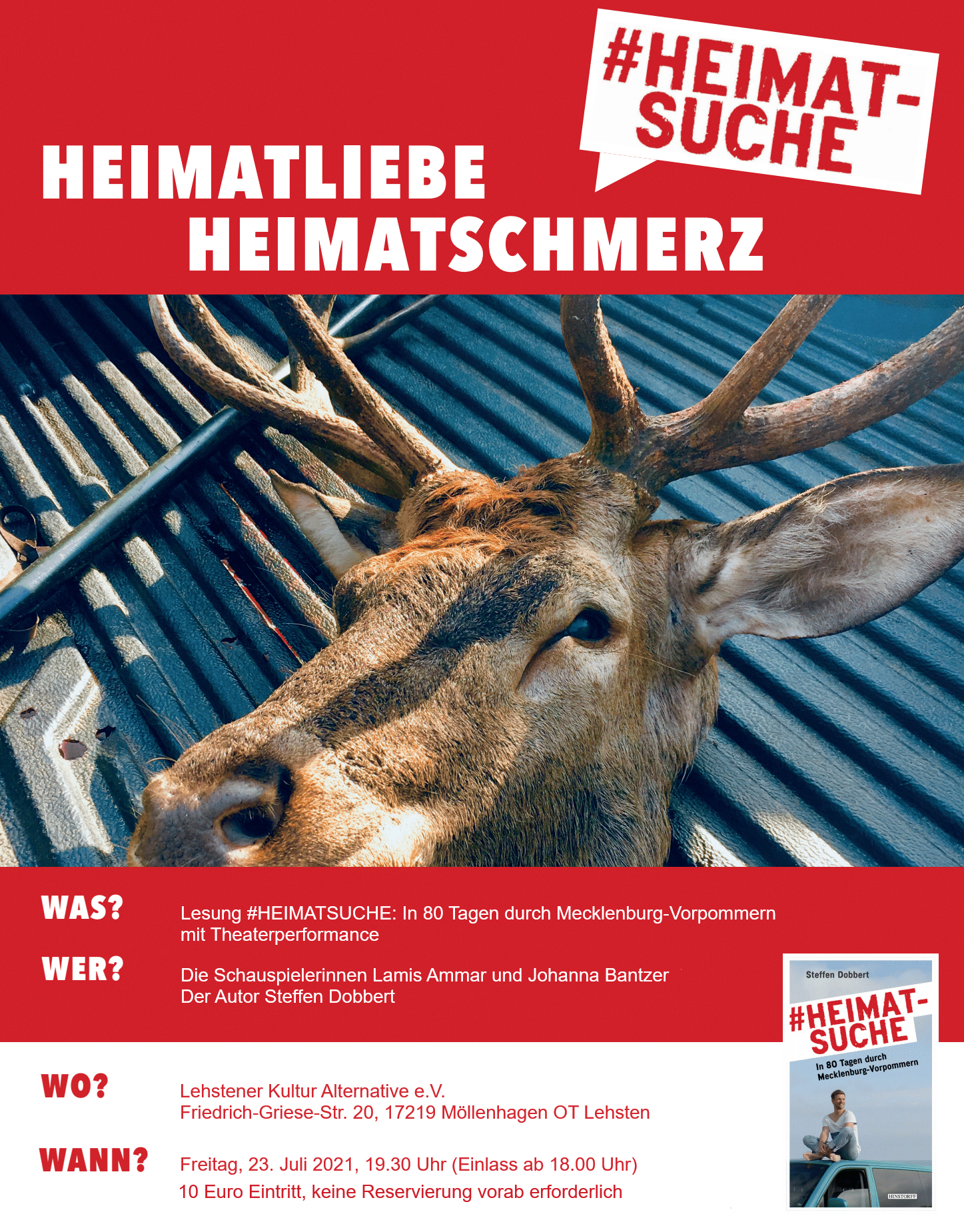 Die Schauspielerin Johanna Bantzer und der Buchautor Steffen Dobbert lesen am kommenden Freitag, 23. Juli, ab 19.30 Uhr in der KulturKolchose Lehsten gemeinsam aus dem dieses Jahr erschienenen Buch „#heimatsuche. In 80 Tagen durch Mecklenburg-Vorpommern“. Steffen Dobberts Buch führt uns kreuz und quer durch Mecklenburg-Vorpommern.