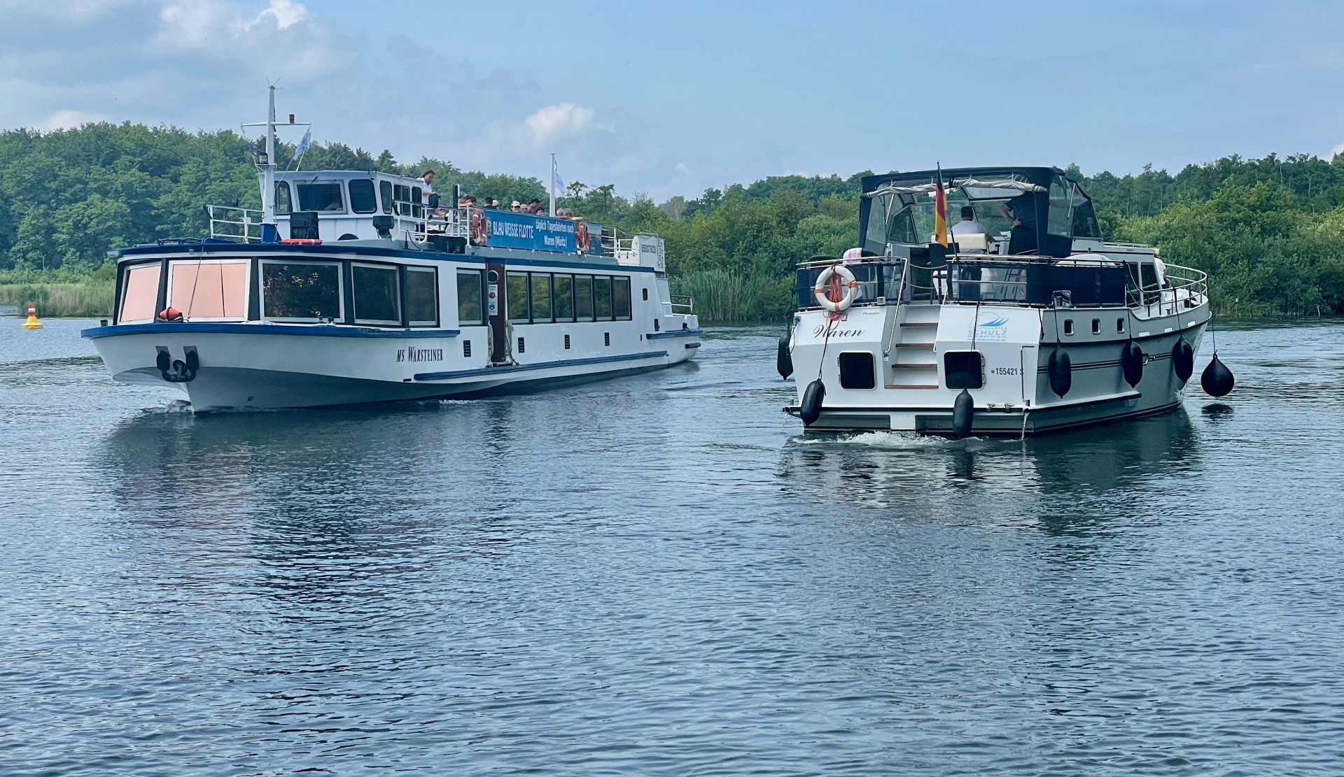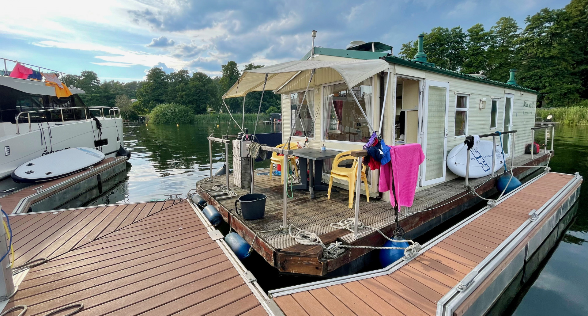 Schon beim Buchen etwa acht Wochen vor dem Urlaub das erste Problem: Alles weg. Ein Ponton mit einem Häuschen oben drauf war für eine Woche gerade noch frei. Glück gehabt. Die Buchung über ein Reise-Portal lief problemlos. An einem Sonnabend um 14 Uhr sollte die Übergabe sein. Aber – erstens kommt es anders, zweitens, als man denkt… Kurz vor der Bootsübernahme der Anruf des privaten Vermieters: Die Urlauber vor uns, so berichtet er, hatten Grundberührung, in einem Ponton ist ein Leck. Dennoch ziehen wir mit Sack und Pack aufs Boot und fahren – begleitet von Personal des Vermieters, ‚rüber nach Malchow – zwei Stunden immer mit dem Gedanken im Hinterkopf, dass unter uns ja irgendwo ein Leck ist. Für Landratten eine ziemlich beängstigende Vorstellung. Erst recht auf dem „wilden“ Fleesensee.