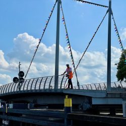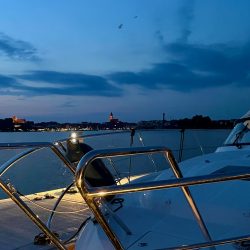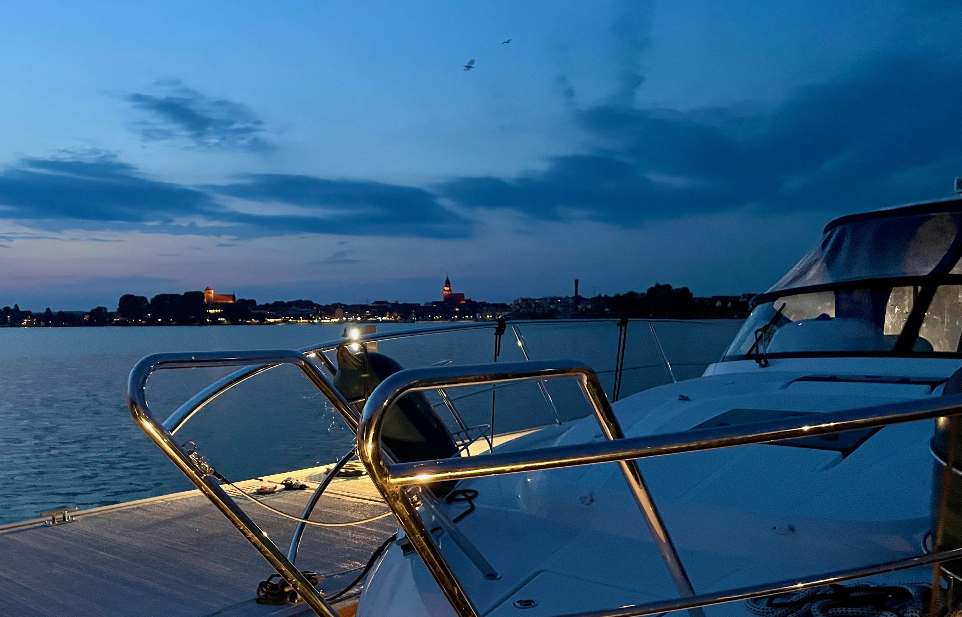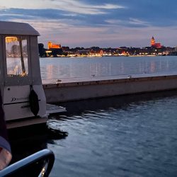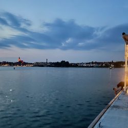 Der laue Sommerabend klingt dann auch ziemlich schnell aus. Zu anstrengend war der erste Tag mit Werftbesuch und Co. Die zweite Nacht ist deutlich entspannter. Beim Einschlafen helfen die Grillen, die am Eldekanal zirpen, und die springenden kleinen Fische, die Umgebung selbst ist sehr ruhig – trotz der vielen Boote, die dort liegen.