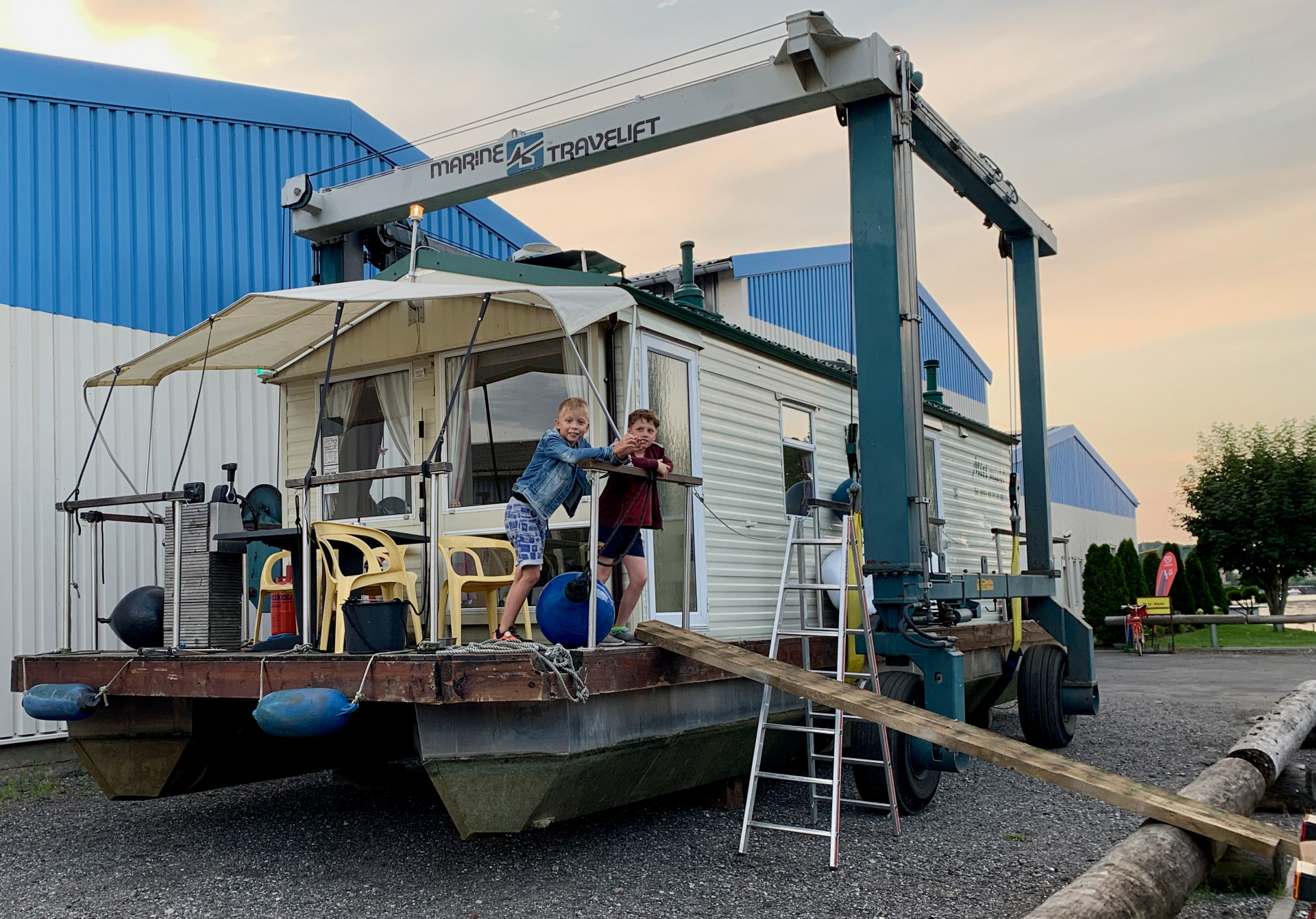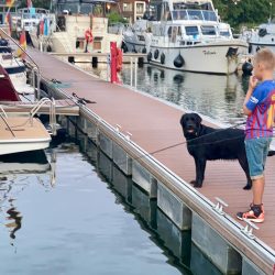 An der Werft in Malchow wartet man auf uns. Wir werden mit dem Boot von einem Kran an Land gehievt. Und da hängen wir jetzt. Während die Kinder und Erwachsenen die Leiter hinunter steigen können, sieht das bei der Hündin schon anders aus. Leiter steigen ist nicht. Also wird improvisiert – zwei lange Bretter dienen als Steg.
