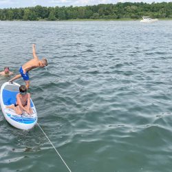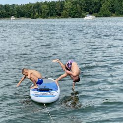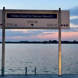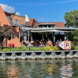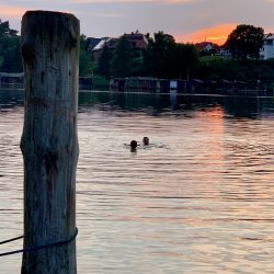 Die Anmeldung beim Hafenmeister war problemlos. WLan gibt es in der noch nicht ganz fertiggestellten Marina aber nicht. Dafür die Gaststätte „Oh Julia“ mit Netz, und die steuern wir dann auch gleich an. Ein bisschen arbeiten mit Blick auf die Müritz und einem leckeren Antipasti-Teller vor der Nase… Auch die Hauptgerichte überzeugen. Also melden wir uns gleich mal für den nächsten Tag zum Frühstück an. Am Abend erobern einige Jugendliche den Steg von „MareMüritz“. Sie wollen baden. Die Kinder halten ihre Angeln ins Wasser, und die Jugendlichen fragen sogar höflich, ob es stört, wenn sie dort schwimmen. Einer klettert aufs Begrüßungsschild, um von dort oben in die Müritz zu hechten. Störend ist die Anwesenheit der jungen Leute nicht, eher amüsant und unterhaltsam.